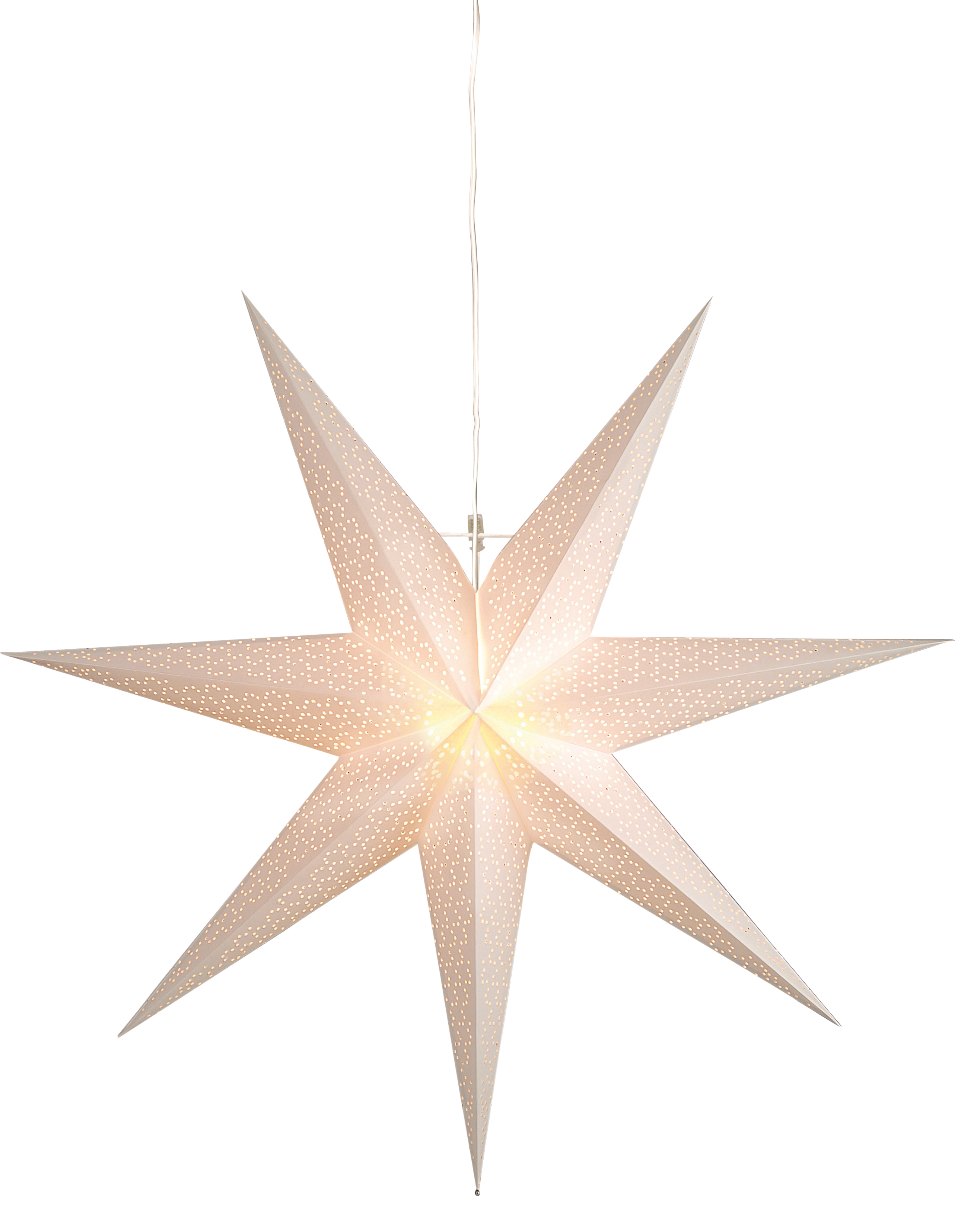 Hengende stjerne i papir. Høyde 100 cm. Dybde 16 cm. Bredde 100 cm. Tilkoblingskabel 3,5 m. E14 sokkel. Lyspære inngår ikke.
