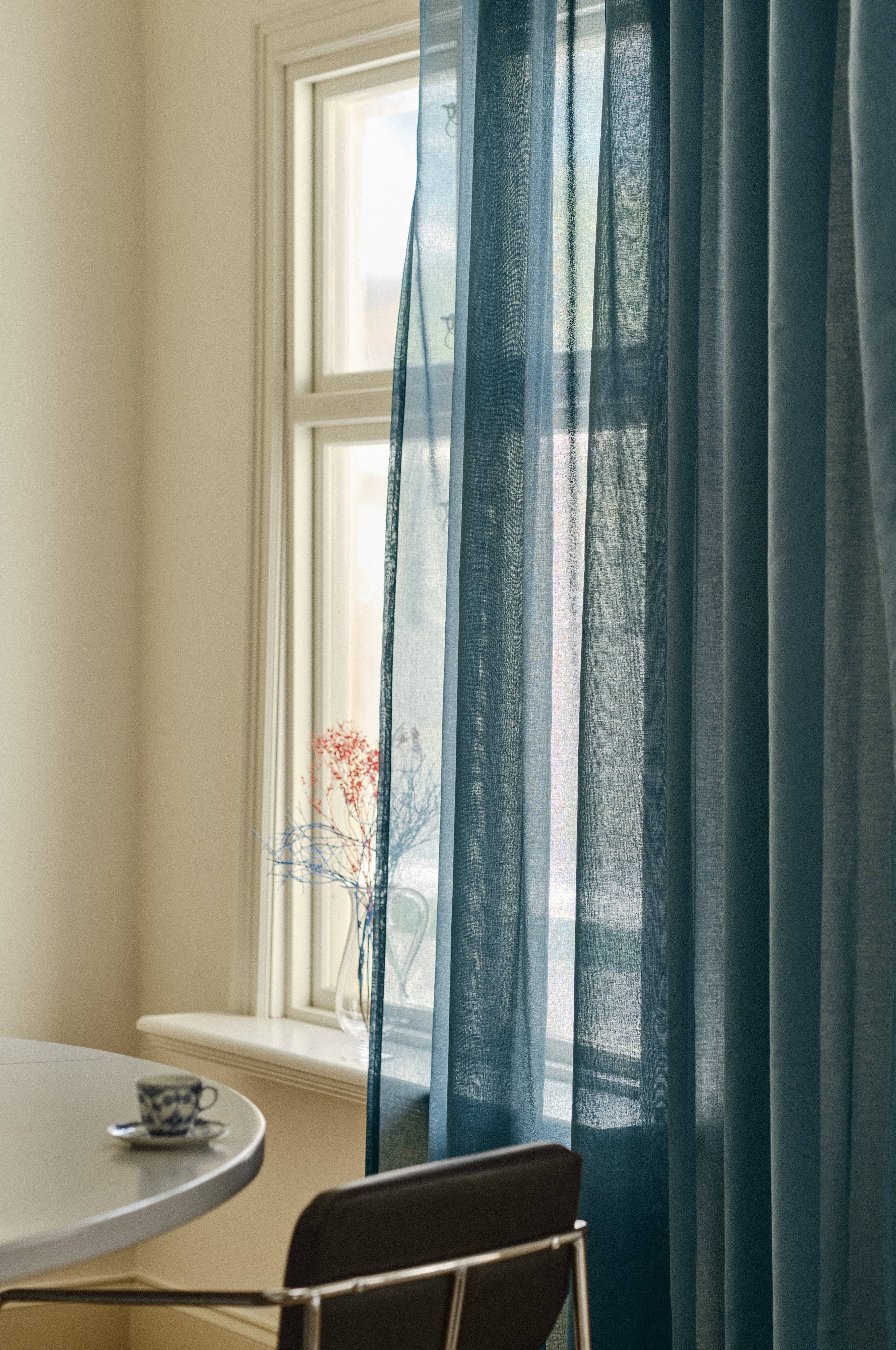En ekstra bred gardinlengde i en delikat og luftig polyestervoile som faller lett og slipper inn rikelig med lys. Hvis du ønsker å trekke den ekstra brede lengden for f.eks. et vindusparti for å få litt privatliv, får du likevel det fantastiske lyset. Hvis du henger den på siden av vinduet, tar den ikke like mye plass, men oppleves som penere. Gardinens materiale er resirkulert.