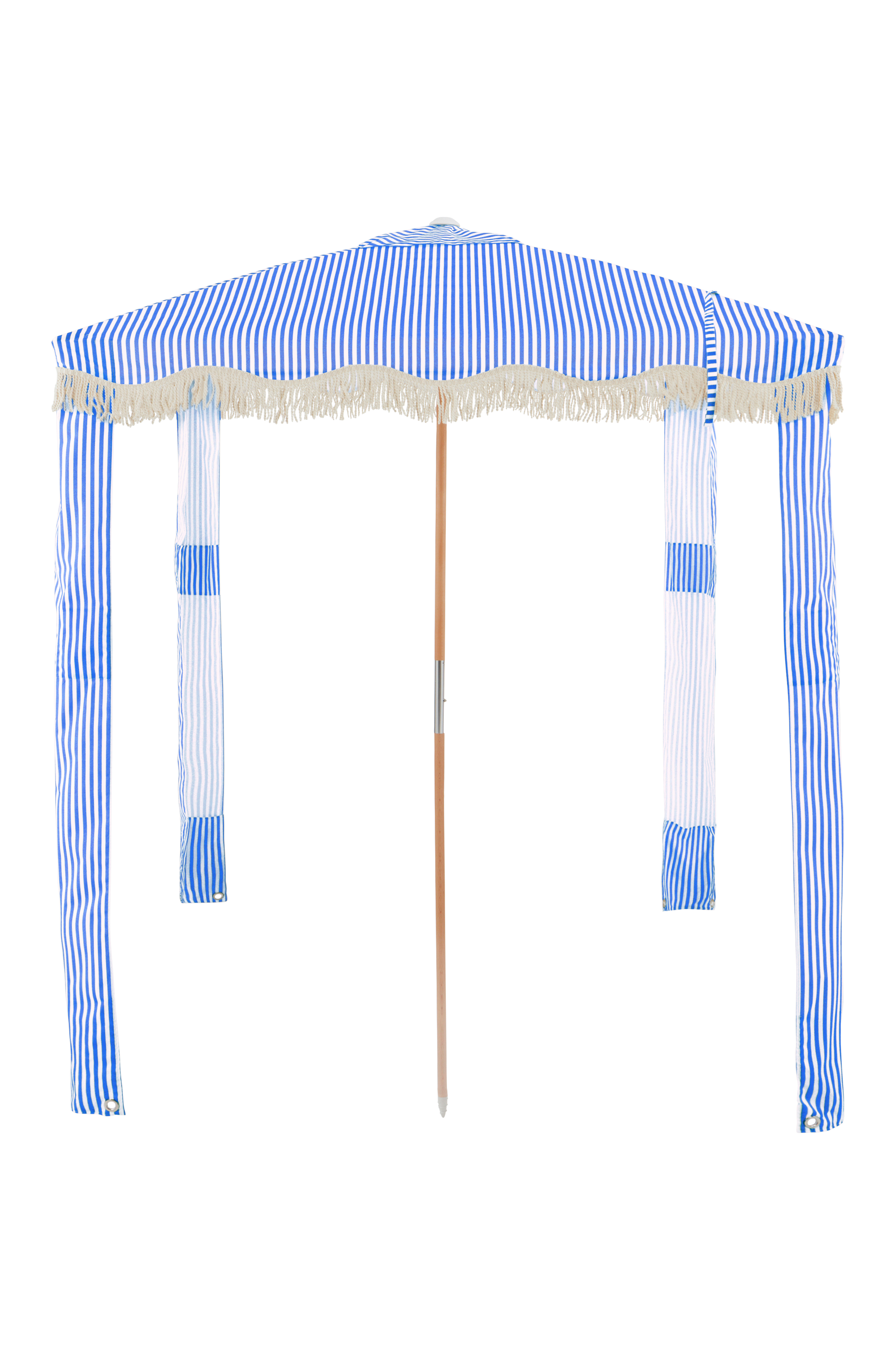 ALMEDA er et stripete strandtelt av tre med vannavvisende stoff av polyester og frynser av polyester/bomull. Stangen i midten er av tre. Teltet gir behagelig skygge på stranden eller i hagen. Parasollskrue til å forankre produktet i bakken/sanden følger med.