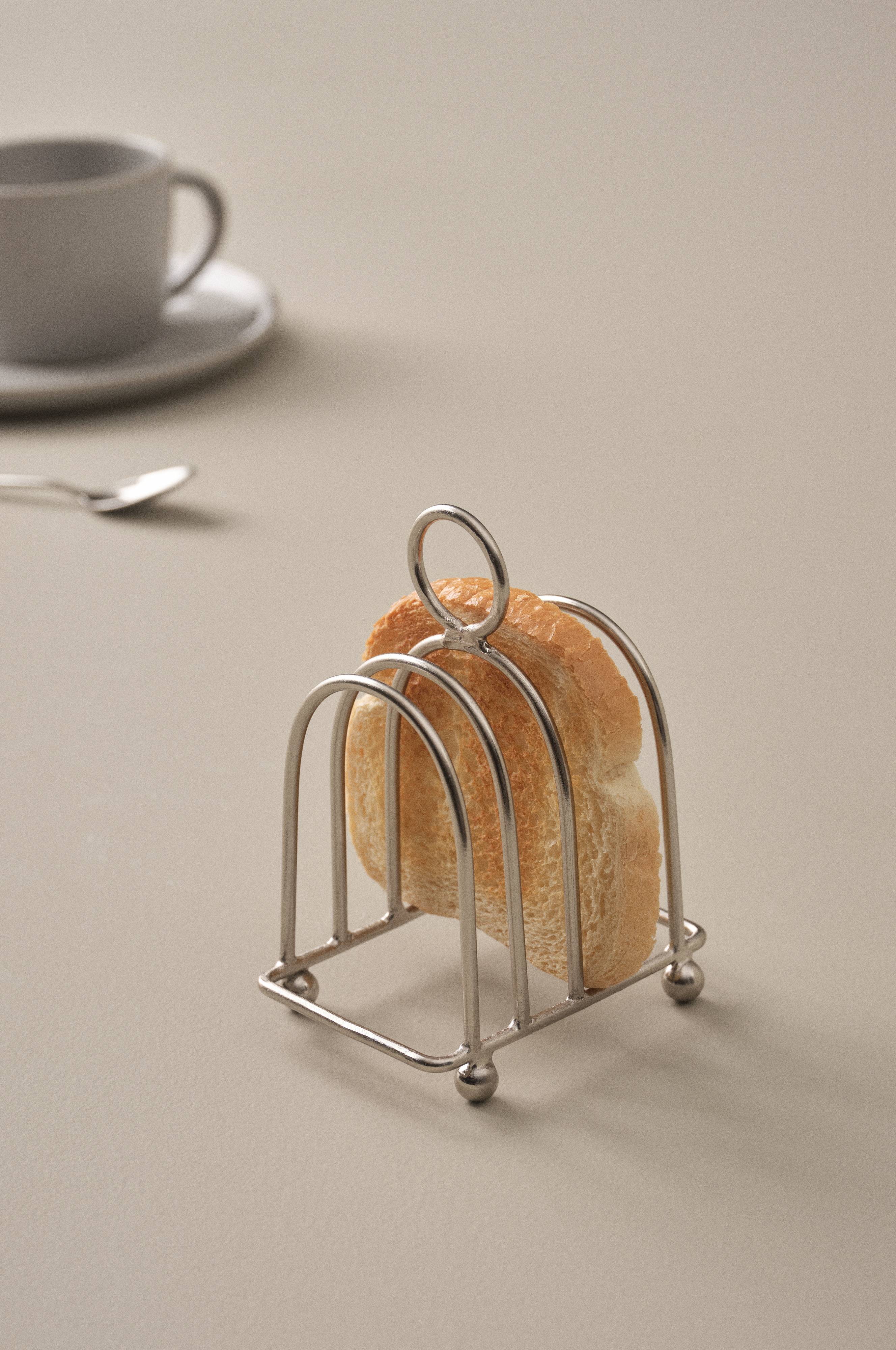Brødstativ av jern som gir herlig tyngde og følelse. Brødstativet gjør frokostbordet herlig klassisk, og rommer seks ristede skiver. Runde små knotter gjør at brødet kommer litt opp fra bordet. Med ringen på toppen løfter du lett brødskivene for å by andre rundt bordet. Metallet har sølvfarget belegg.