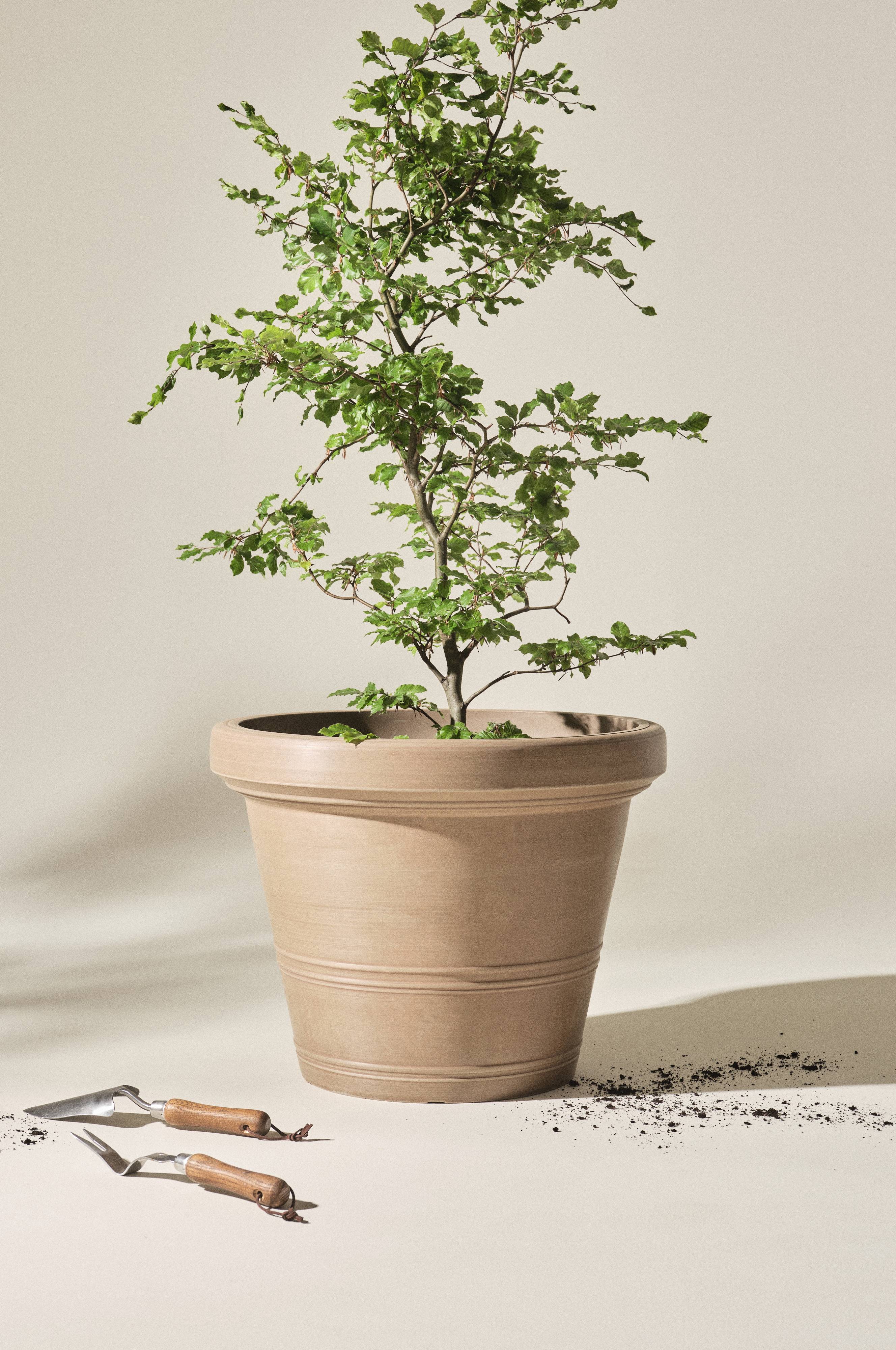 AMY er en utendørspotte formet som en klassisk leirpotte, men er produsert av gjenvunnet komposittmateriale. Fordelen med materialet er at potten er lett å håndtere, den er robust og veier en brøkdel av en leire- eller steinpotte. Den tradisjonelt formede potten har hel bunn med stanset plugg som du kan trykke ut hvis du vil ha hull for drenering i bunnen. Potten fungerer selvsagt like fint innendørs.