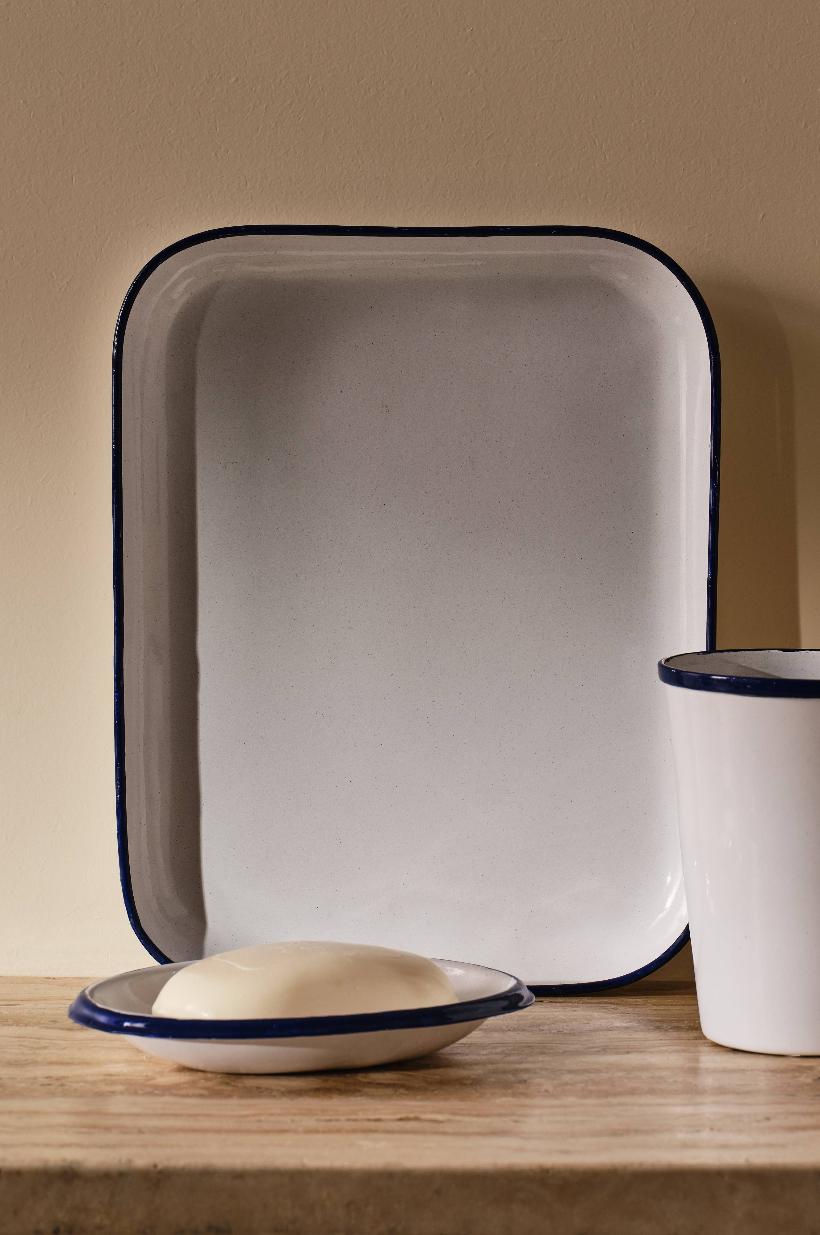 ANNIE er et stilig brett for baderommet i rustfritt stål. Den hvite overflaten har en delikat blå kant som gir en moderne touch. Ideelt for organisering av toalettsaker eller utstilling av pyntegjenstander, og forbedrer enhver baderomsinnredning med sin diskrete sjarm.