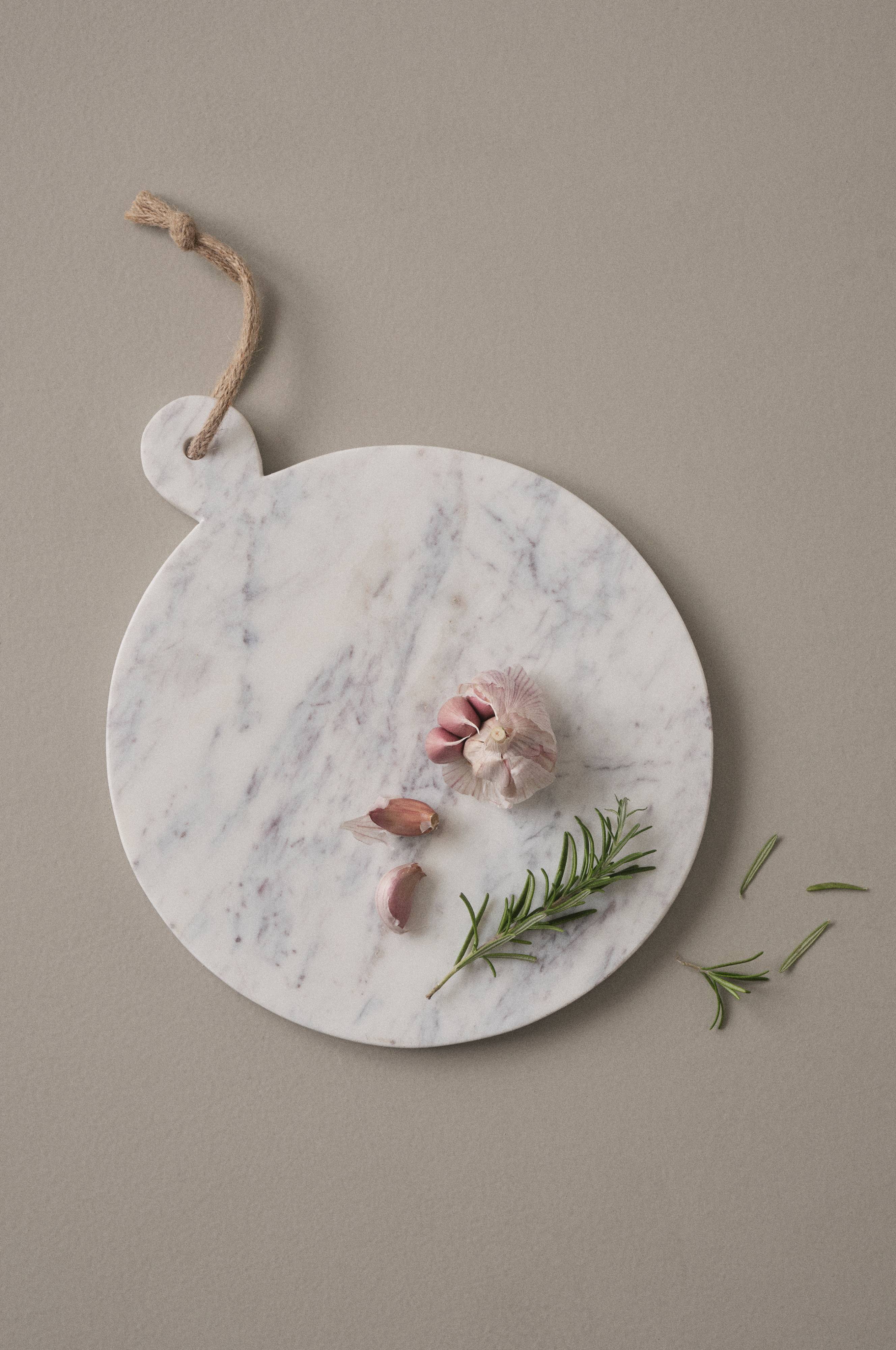 Rund skjærefjøl av marmor med lite hull i håndtaket. Skjærefjølen er fint som serveringsfat. Den er også vakker å henge på veggen når den ikke er i bruk. Marmor er en naturstein, og mønsteret varierer alltid litt avhengig av bergartens sammensetning. Dette gjør hvert objekt unikt.