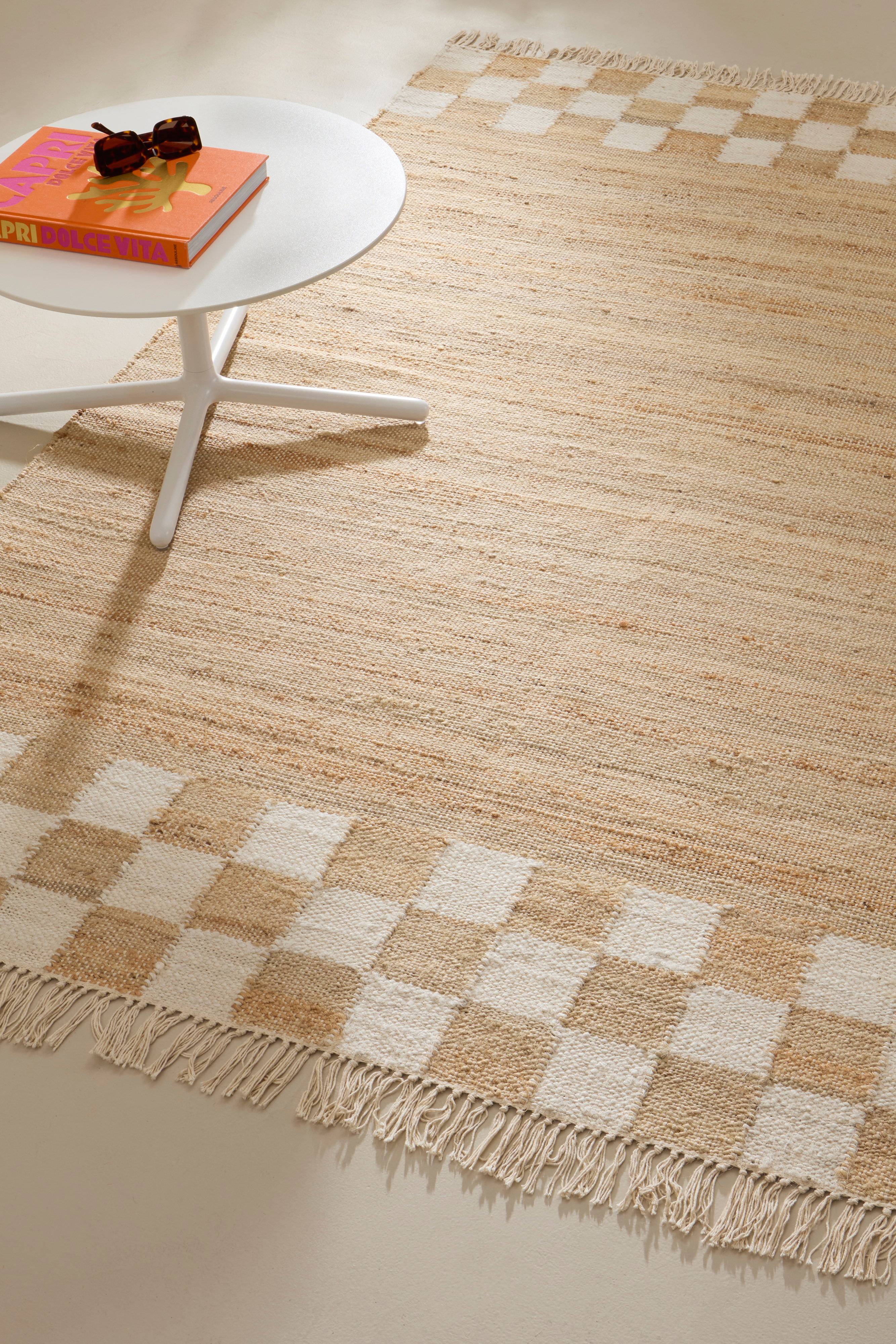 Jute-teppet AUREA har en rustikk sjarm med en bred rutete kant og frynser. Det naturlige materialet byr på unike farge- og størrelsesvariasjoner, noe som gjør teppet unikt. Dette håndlagde teppet er perfekt for stuen eller soverommet, og tilfører et koselig preg og en varm atmosfære til ethvert rom.