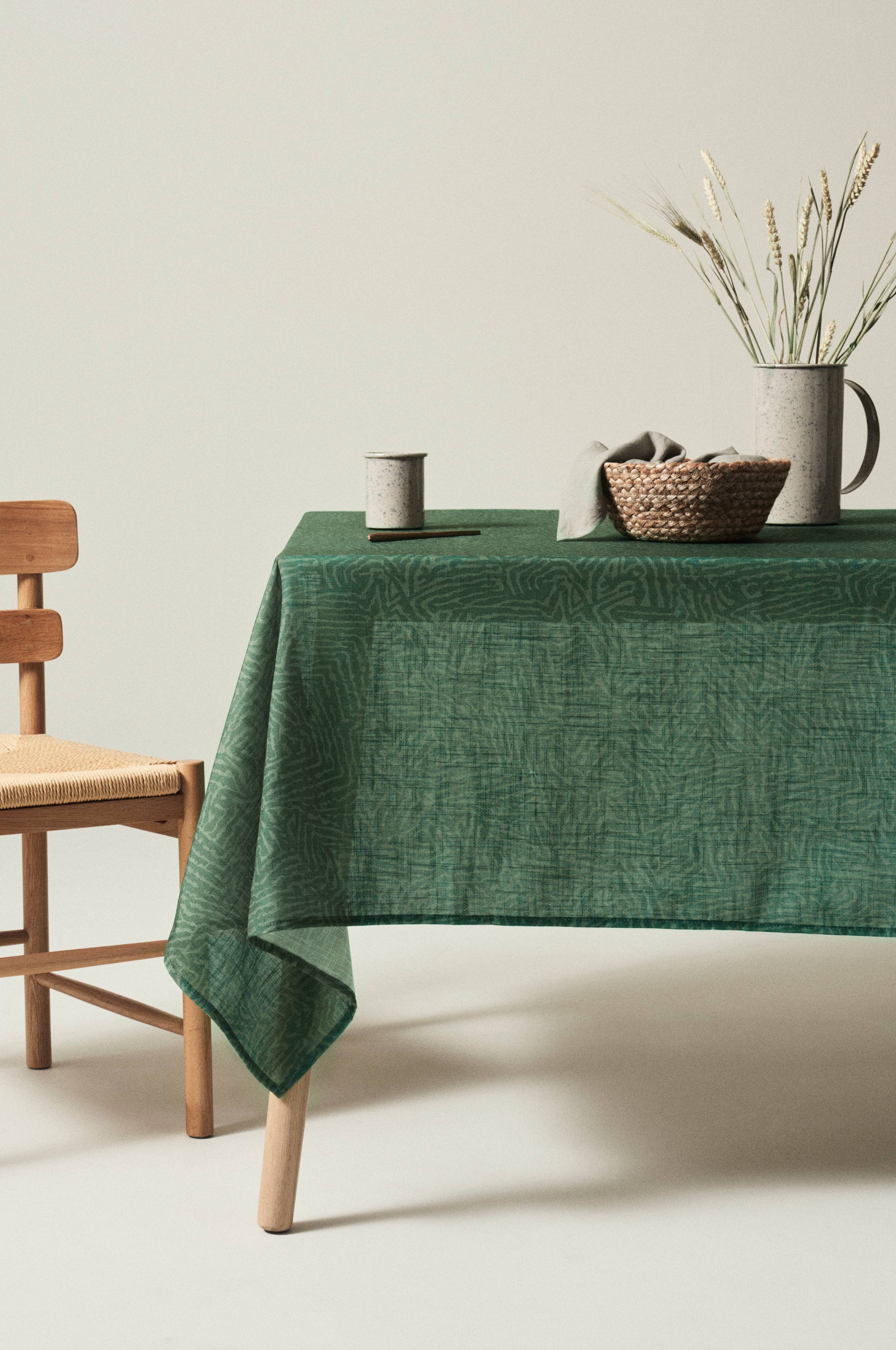 Duk i mønstertrykt polyester som er pent, løst vevd og litt tynn. Det lekre mønsteret, som assosierer til naturen på mange måter, i kombinasjon med en lett og smidig kvalitet, gir oppdekkingen flott karakter.