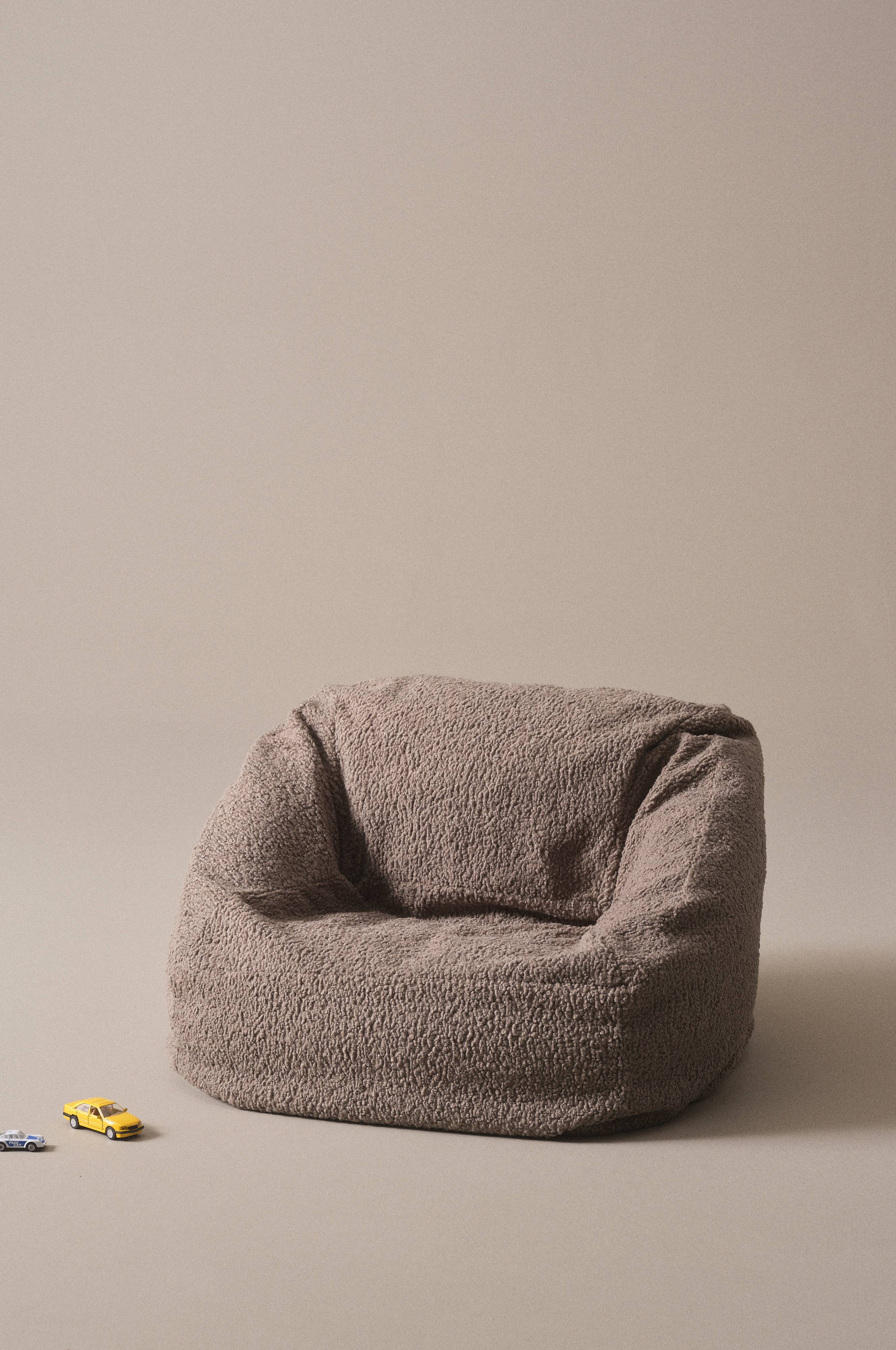 En koselig barnestol med avtakbart trekk i mykt teddystoff og fyll av plastkuler. Det robuste teddystoffet har slitestyrke på 100 000 Martindale. Et deilig sted å hvile. Lenestolen har et praktisk håndtak bak slik at barnet enkelt kan flytte den rundt. Dessuten er det enkelt å henge sekken opp på en krok når det er tid for rengjøring!