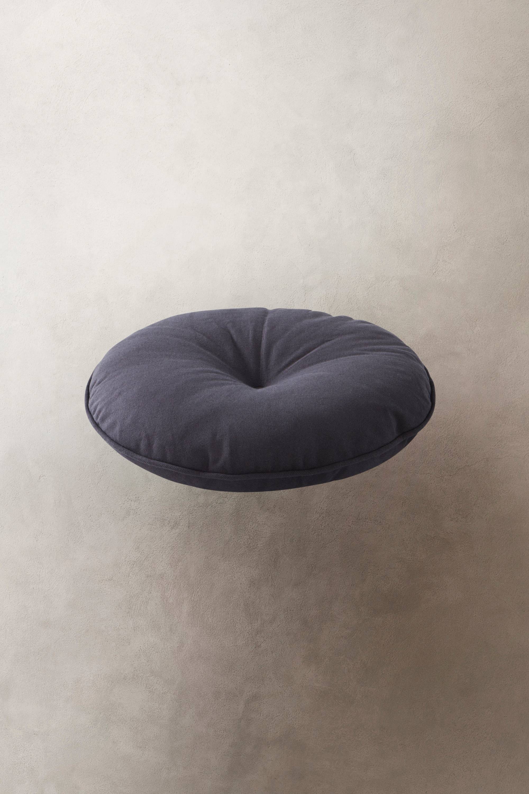 Rund sittepute i ensfarget bomullsstoff med myk stopp. Puten er herlig stor, og har 1 dyptheftet knapp i midten og passepoilkant rundt.