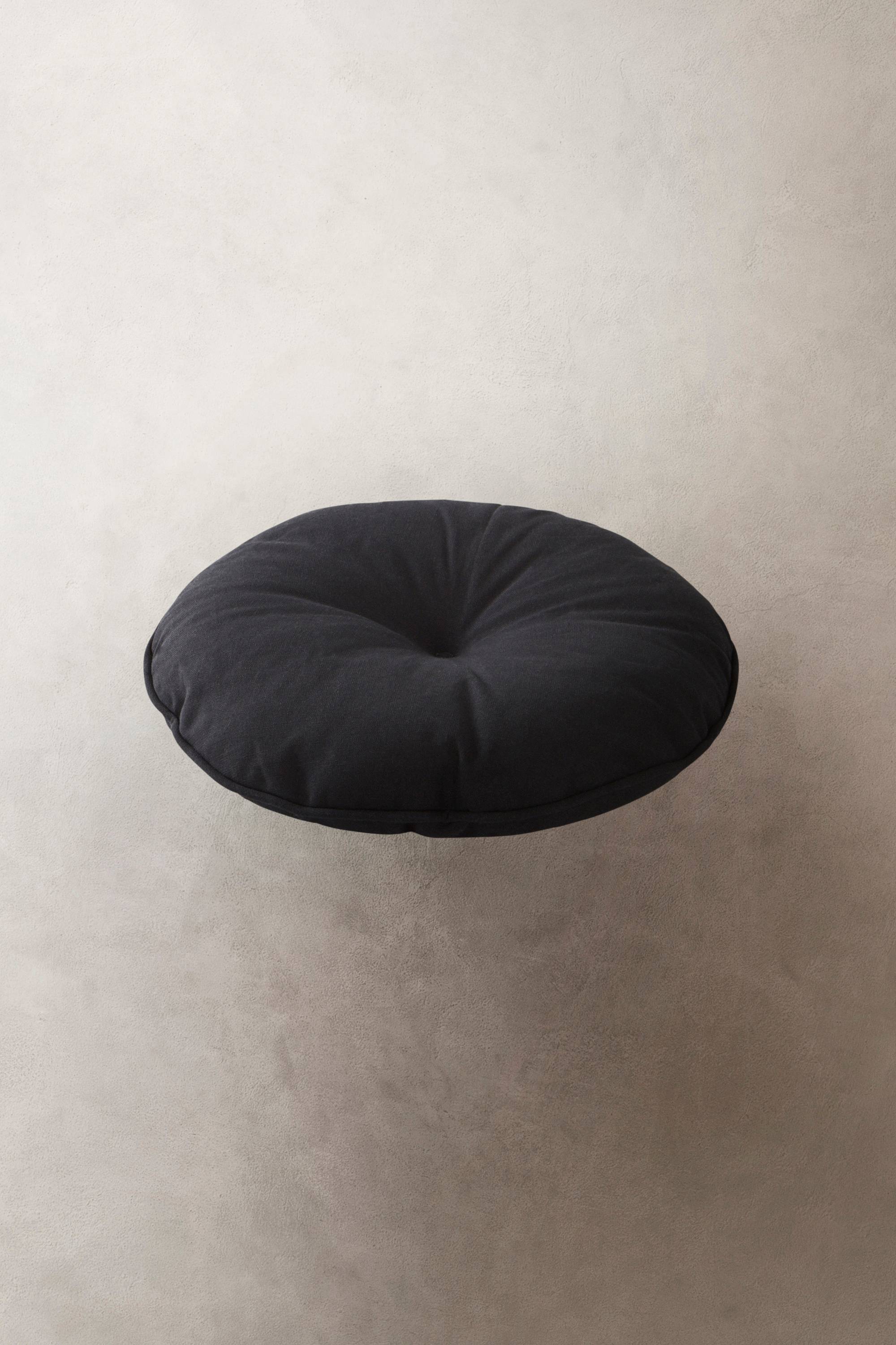 Rund sittepute i ensfarget bomullsstoff med myk stopp. Puten er herlig stor, og har 1 dyptheftet knapp i midten og passepoilkant rundt.
