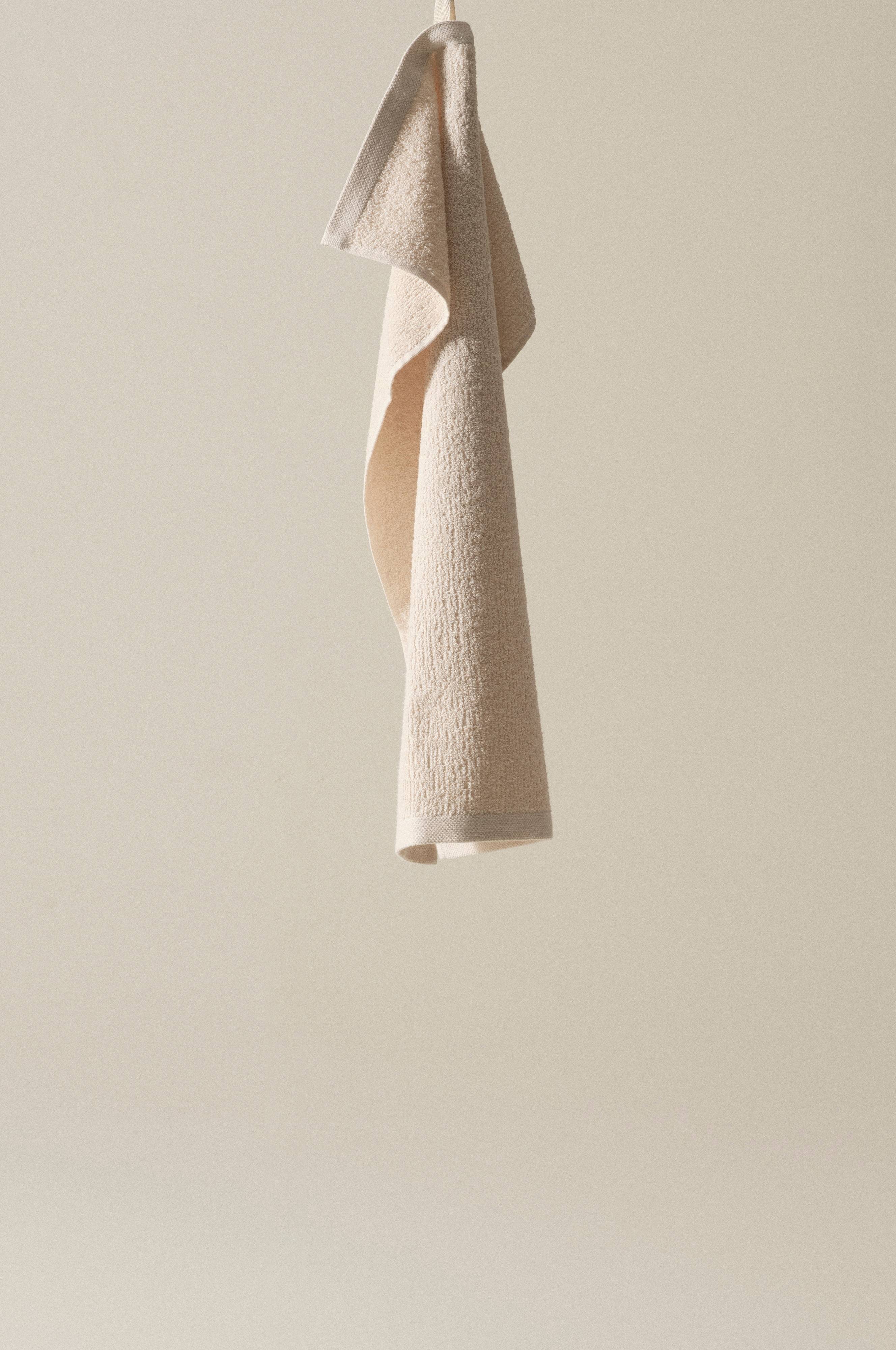 1-pk håndkle av myk bomullsfrotté i en blanding av like deler økologisk bomull og gjenvunnet bomull. Håndkleet er lett melert med ulik tekstur på begge sider. BELLFI er i en fin, mild, nøytral farge som matcher fint i de fleste bad. Gramvekt 450 g/m².