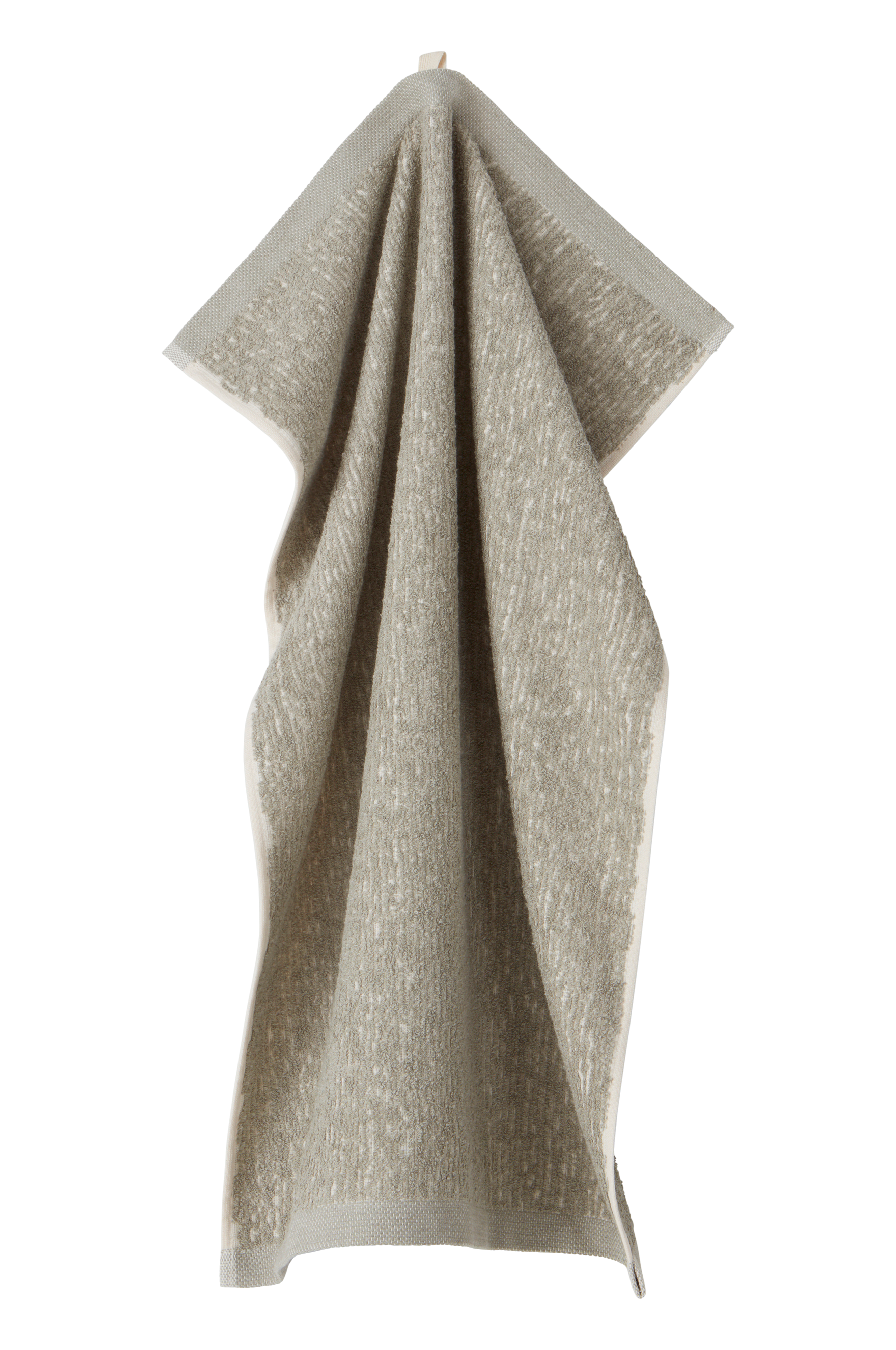 1-pk håndkle av myk bomullsfrotté i en blanding av like deler økologisk bomull og gjenvunnet bomull. Håndkleet er lett melert med ulik tekstur på begge sider. BELLFI er i en fin, mild, nøytral farge som matcher fint i de fleste bad. Gramvekt 450 g/m².
