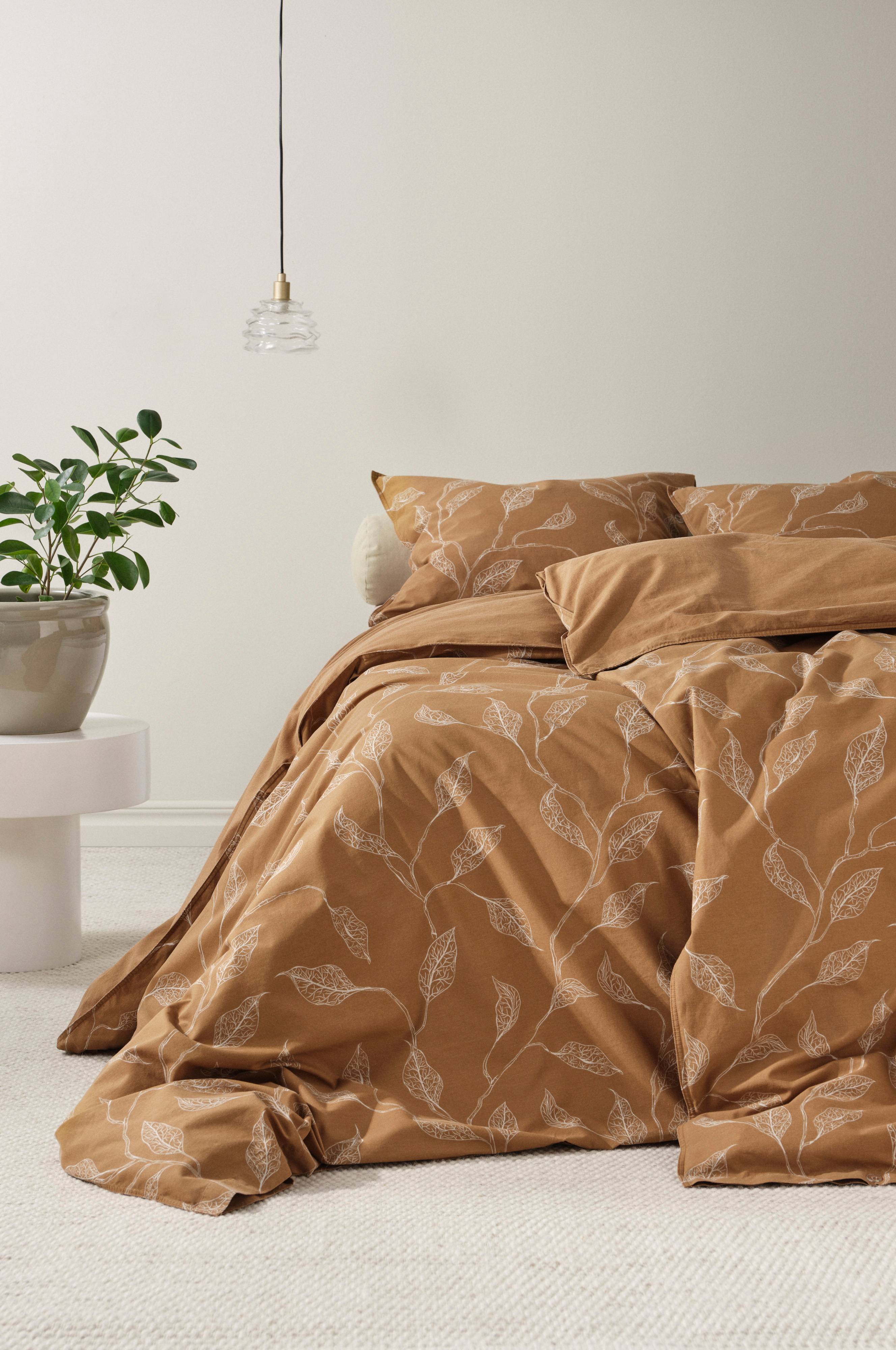 Sengesett i 2 deler av myk bomull med trykt bladmønster som er harmonisk i fargeskalaen og passe diskre. 70% av bomullen er gjenvunnet materiale og stoffet er enzymvasket. Det gir en myk og behagelig, lett slitt følelse. Bomullsstoff er luftig og deilig, og føles behagelig mot huden. Dobbeltsøm rundt og transparente plastknapper for lukking både på putevar og dynetrekk. Trådtetthet på 120 tc. (Trådtettheten forteller om antallet tråder, thread counts, pr. kvadrattomme i et stoff. Jo høyere trådtetthet, desto høyere kvalitet.)