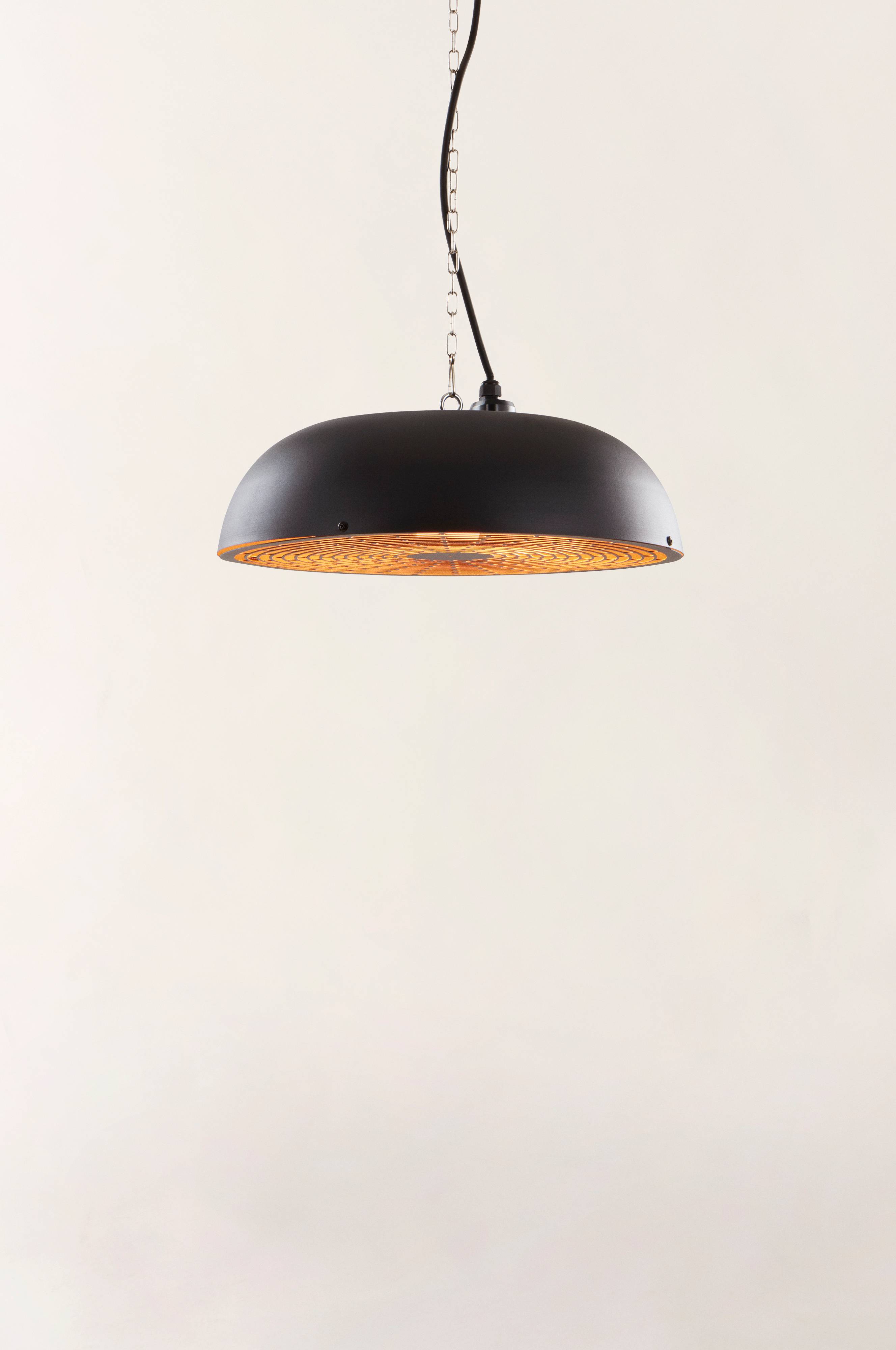 Hengende terrassevarmer for utendørs bruk. Terrassevarmeren er i stål med pulverlakkert overflate og ser mer ut som en pen lampe enn en terrassevarmer så den er dekorativ når den ikke brukes. Terrassevarmeren skal henge i taket slik at den sprer varmen nedover på en behagelig måte i uterommet, på balkongen, i campingvognens fortelt eller på uteserveringen. Terrassevarmeren gir umiddelbar varme og et behagelig varmt lys. Terrassevarmeren har 1,9 m jordet ledning med stikkontakt.