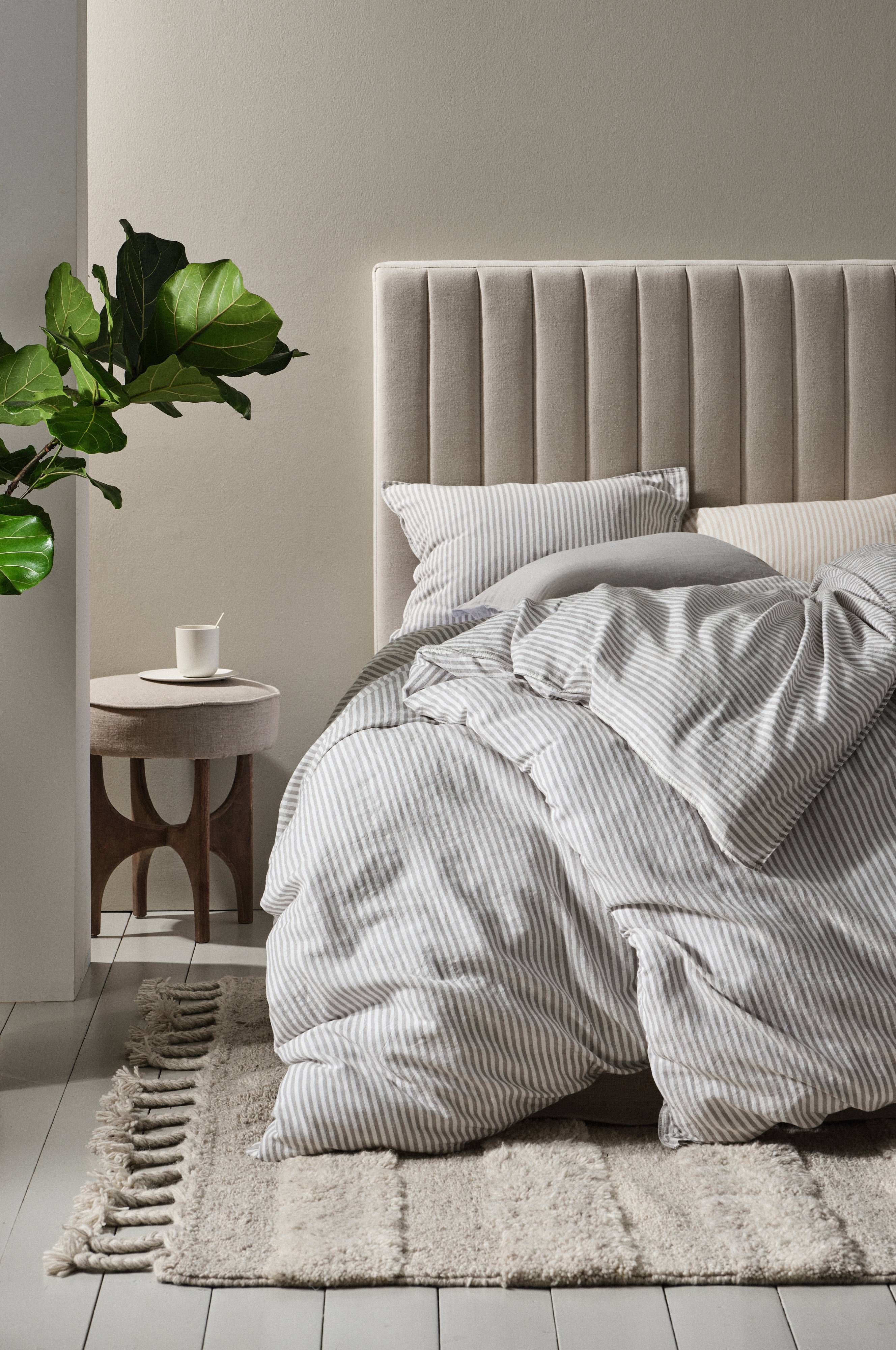Stripete dynetrekk i en deilig blanding av bomull og lin. Sengetøyet i serien BETLEY STRIPE er i en herlig kvalitet som henter fordelene fra både bomull og lin når du rer opp med dem. De smale stripene går i to harmonerende fargenyanser. Dynetrekket har dobbeltsøm som skaper en fin liten vinge rundt. Lukkes med små plastknapper. Vekt 170 g/m². Trådtetthet på 74 tc. (Trådtettheten forteller om antallet tråder, thread counts, pr. kvadrattomme i et stoff. Jo høyere trådtetthet, desto høyere kvalitet. Unntaket er lin som ofte veves løsere for å få den riktige følelsen.)