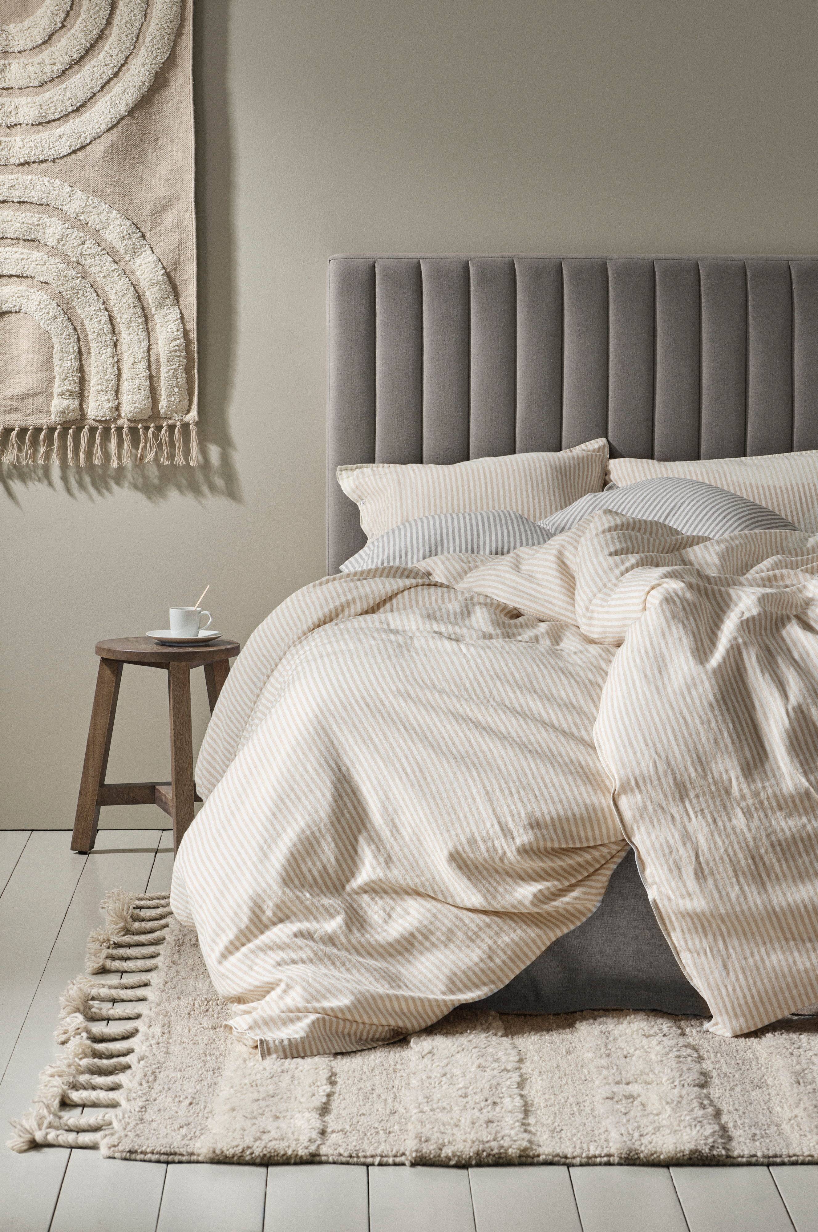 Stripete sengesett med putevar og dynetrekk i en deilig blanding av bomull og lin. Sengetøyet i serien BETLEY STRIPE er i en herlig kvalitet som henter fordelene fra både bomull og lin når du rer opp med dem. De smale stripene går i to harmonerende fargenyanser. Både dynetrekk og putevar har dobbeltsøm som skaper en fin liten vinge rundt. Lukkes med små plastknapper. Vekt 170 g/m². Trådtetthet på 74 tc. (Trådtettheten forteller om antallet tråder, thread counts, pr. kvadrattomme i et stoff. Jo høyere trådtetthet, desto høyere kvalitet. Unntaket er lin som ofte veves løsere for å få den riktige følelsen.)
