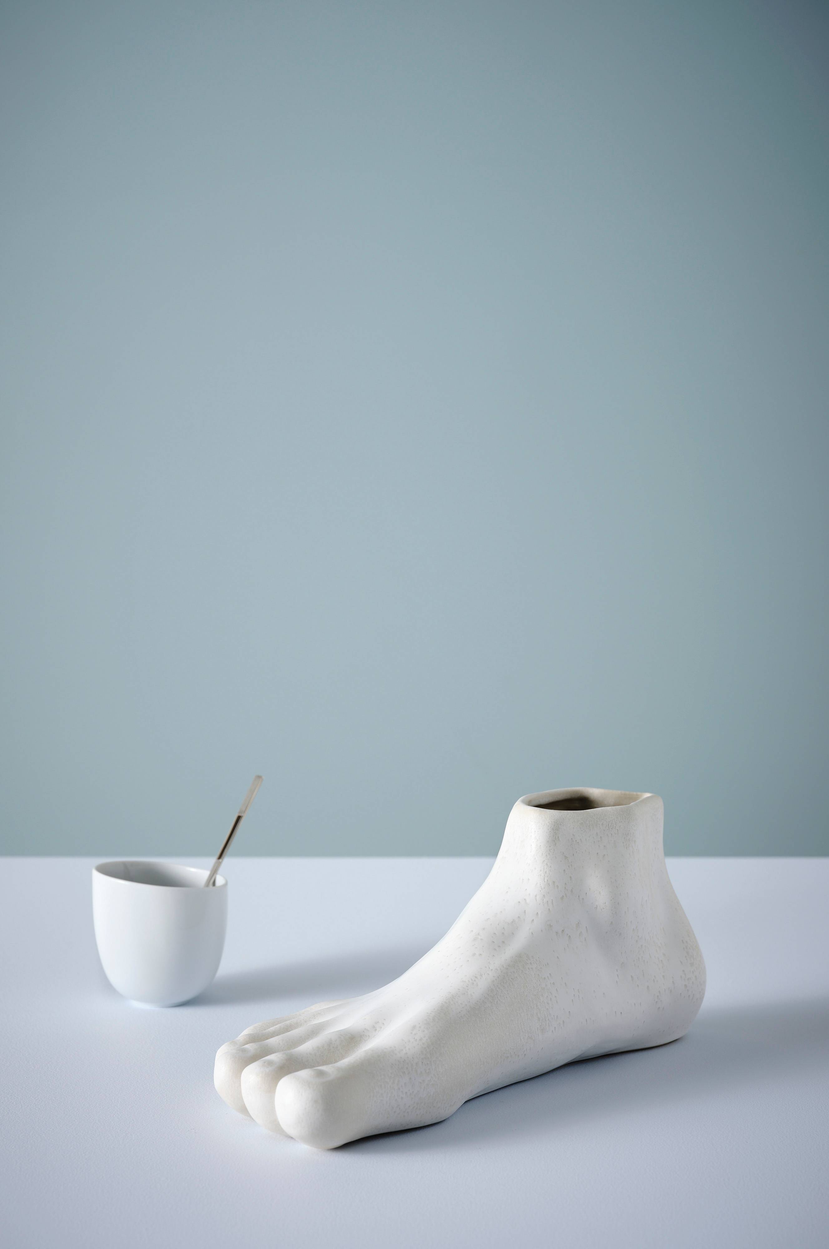 Håndlaget dekorfigur av keramikk formet som en fot.