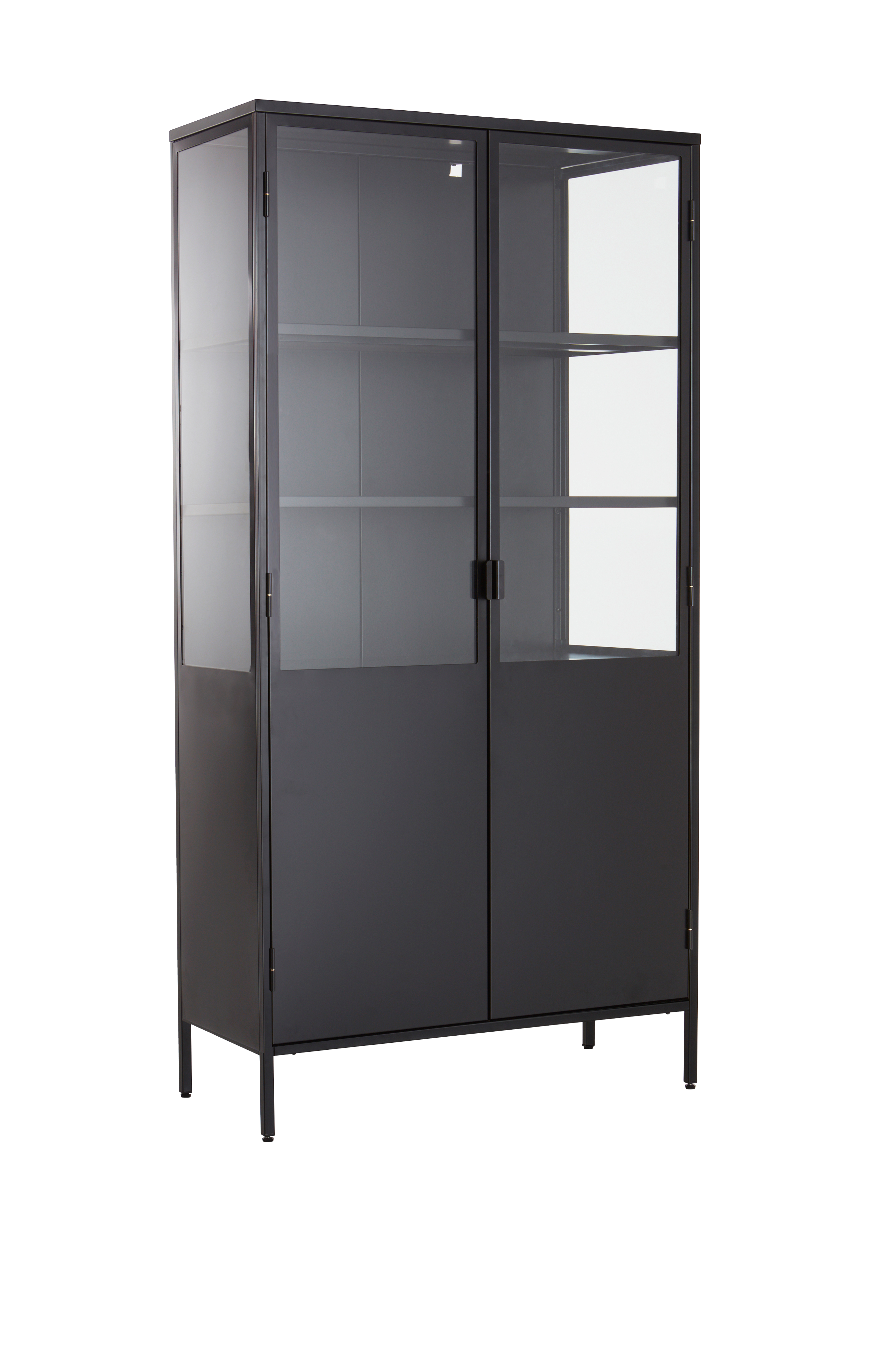 Vitrineskap i metall med dører av herdet glass. BLACKBURN har praktiske, dype hyller som gjør at du får plass til mye. Noe montering kreves, monteringsanvisning medfølger.