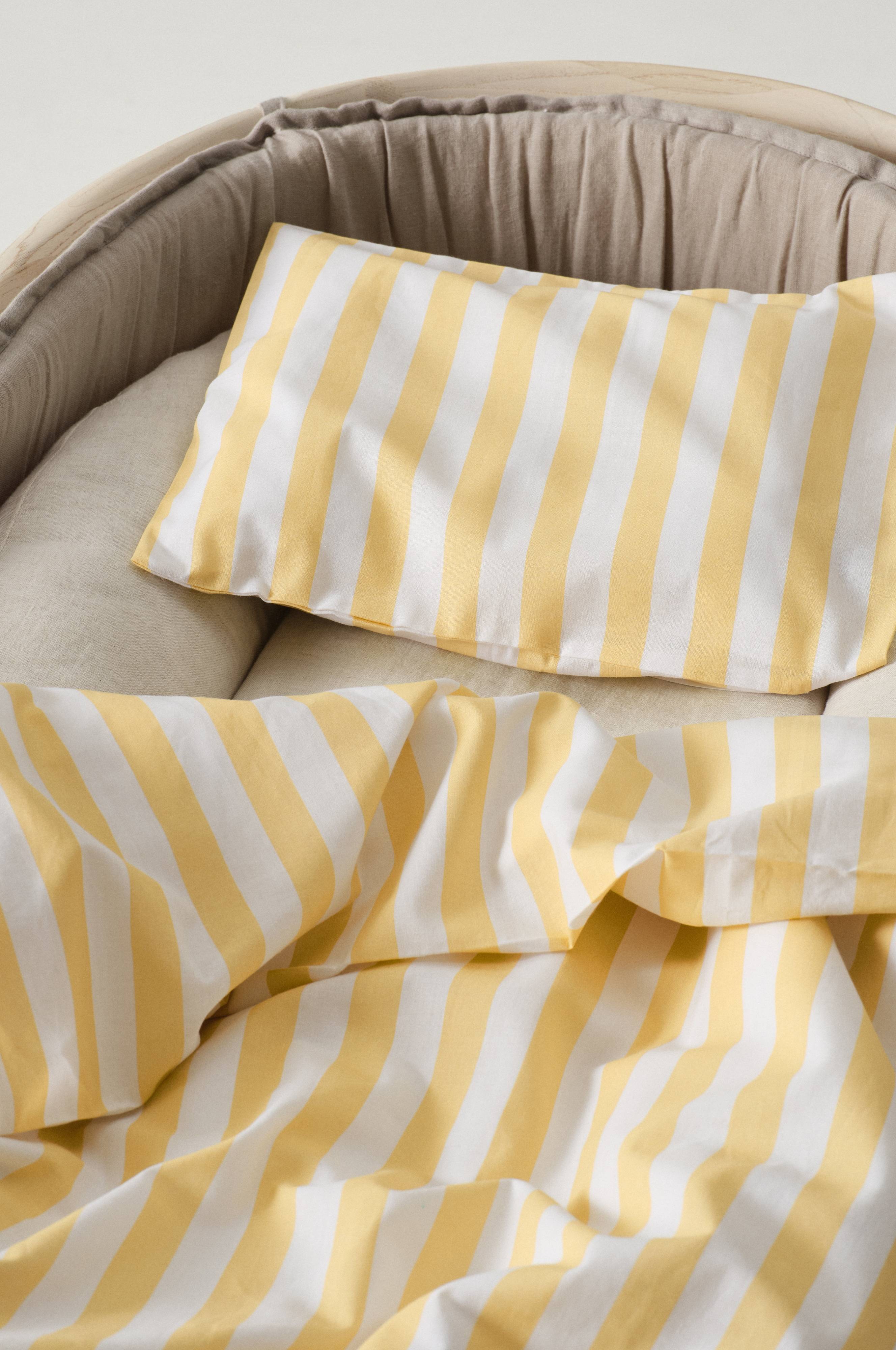 Smalstripete sengesett med et dynetrekk og et putevar i økologisk bomull. Settet passer til barnevogn og vugge. Stoffet har et behagelig trykk, og bomull er sval og deilig mot huden. Stripemønsteret er trykt i klare, glade farger blandet med annenhver stripe i hvitt. De klassiske stripene fungerer like fint til liten som stor. Trådtetthet på 144 tc. (Trådtettheten forteller om antallet tråder, thread counts, pr. kvadrattomme i et stoff. Jo høyere trådtetthet, desto høyere kvalitet.)