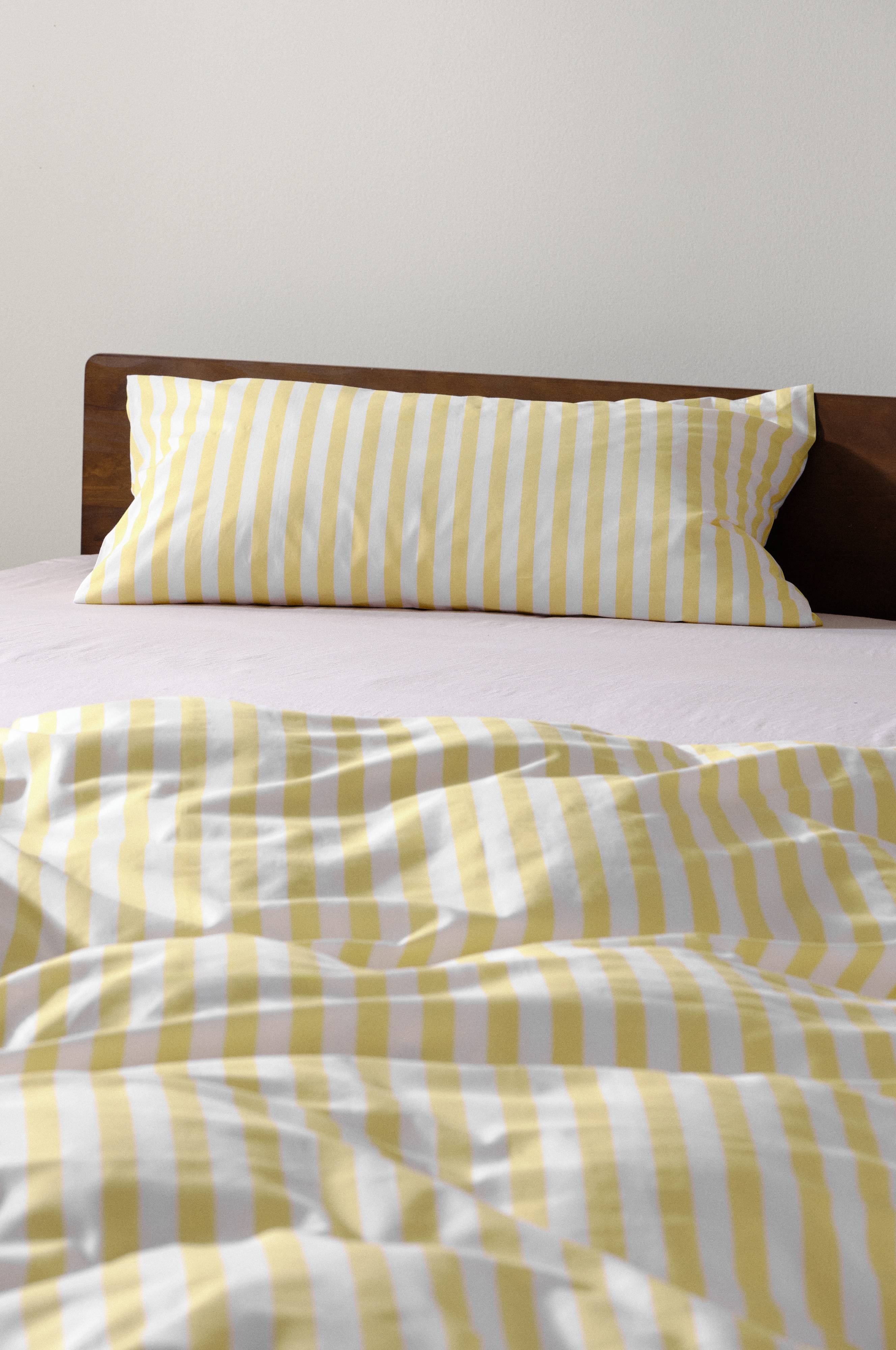 Smalstripet putevar i økologisk bomull. De klassiske stripene fungerer like godt for små og store. Stoffet har et behagelig trykk, bomull er svalt og behagelig mot huden, og følelsen av å krype ned i en nyredd seng er vanskelig å slå. Stripemønsteret er trykt i lyse, muntre farger blandet med annenhver stripe hvit.