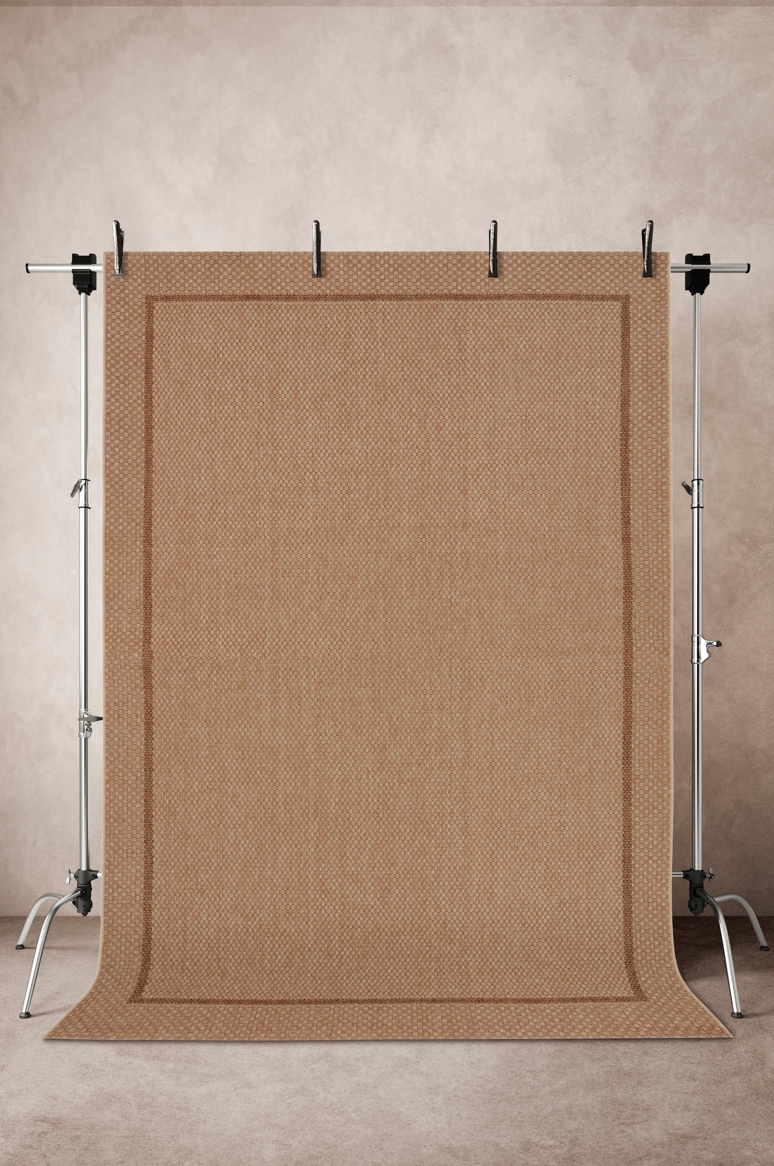 Glattvevd teppe i polypropylen. Teppet har en bred kant rundt seg, som er avgrenset av en stripe i en mørkere farge. Et teppe under utemøbler gir en herlig romfølelse. Den slitesterke kvaliteten og det faktum at det er vannavstøtende, gjør at teppet egner seg i mange rom der det utsettes for litt mer slitasje. Teppet er svært enkelt å ta vare på. Fordi det er vannavstøtende og ikke mugner, kan det også brukes utendørs. Tykkelse: 0,6 cm. 1450 g/m².