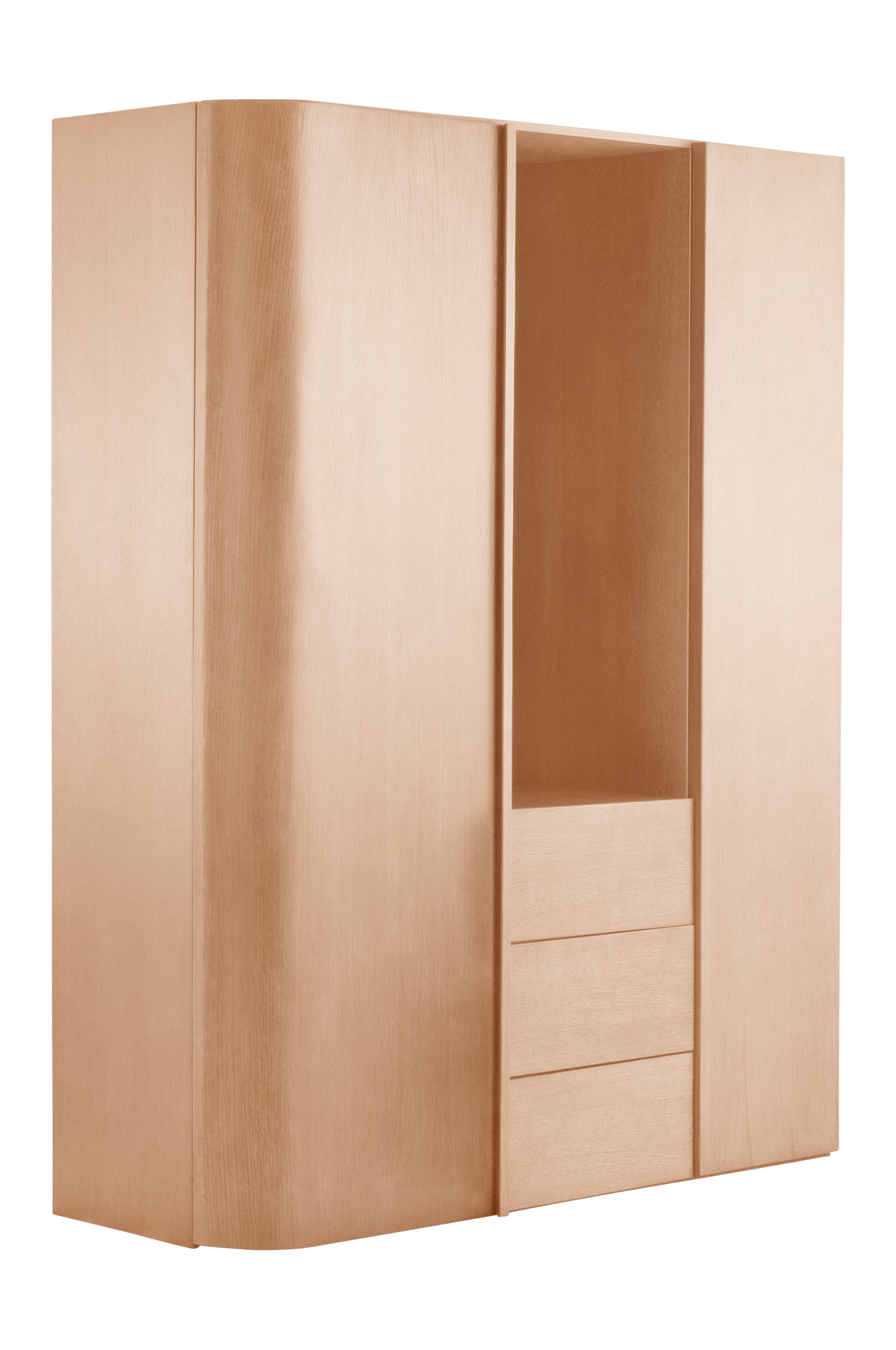 Garderobeskap av MDF med eikefinér på eksponerte flater. Garderobeskapet BRAUX gir et flott inntrykk, og er et pen oppbevaringsmøbel som oser luksus og stil. Mykt avrundede hjørner i forkant forsterker den elegante følelsen. De tre skuffene i midten har en garderobe på hver side. Det åpne rommet over skuffene gir deg muligheten til å være kreativ. Kanskje du vil sette dine pene vesker der? Eller et speil?