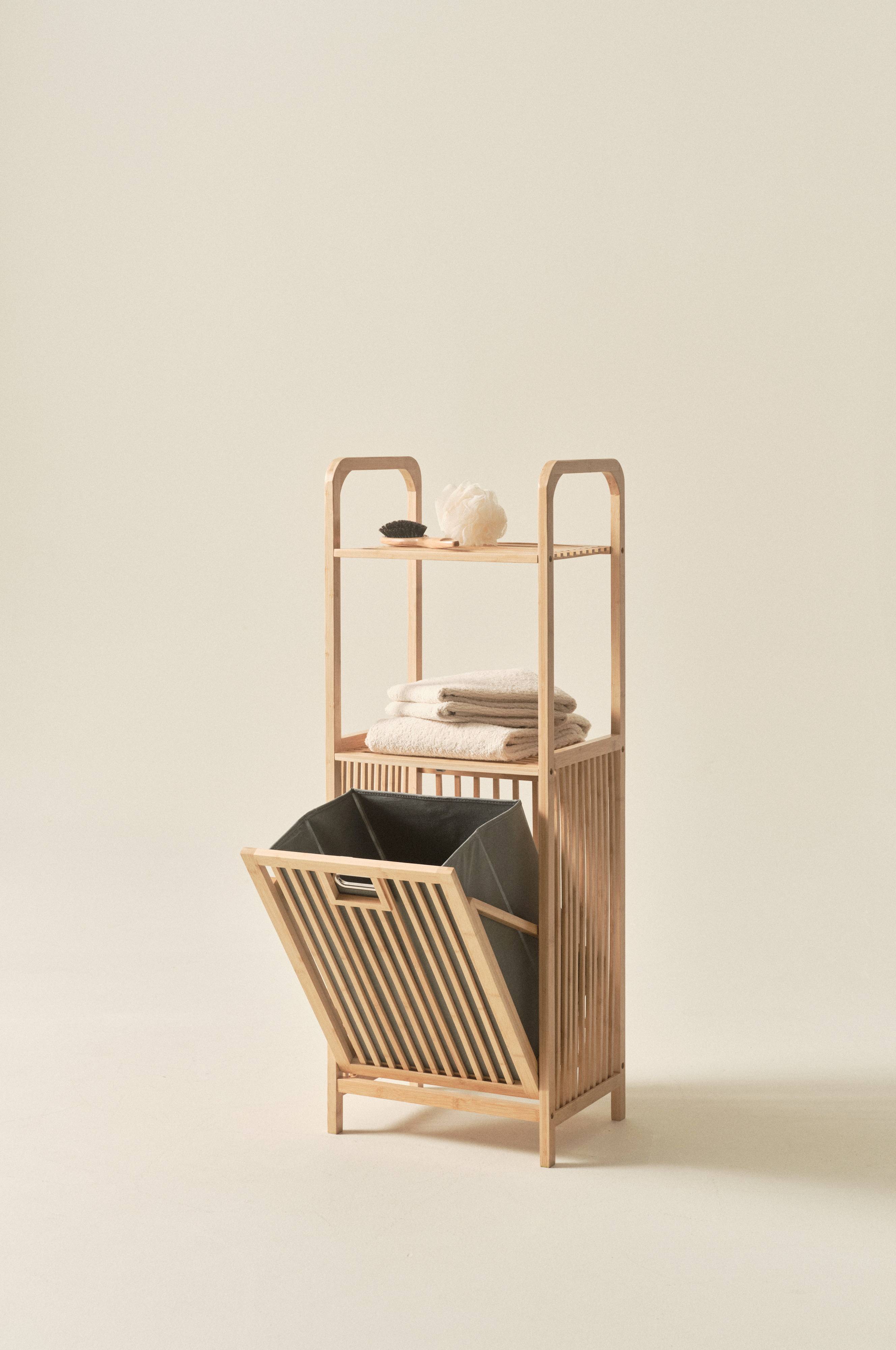 Praktisk og stilren skittentøyskurv i bambus. Smart og pen løsning som skjuler skittentøyet samtidig som du får ekstra oppbevaring. Selve skittentøyskurven kan løftes ut av hyllen og smidig tømmes foran vaskemaskinen. Skittentøyskurven har håndtak av rustfritt stål. Noe montering kreves. Monteringsanvisning medfølger.