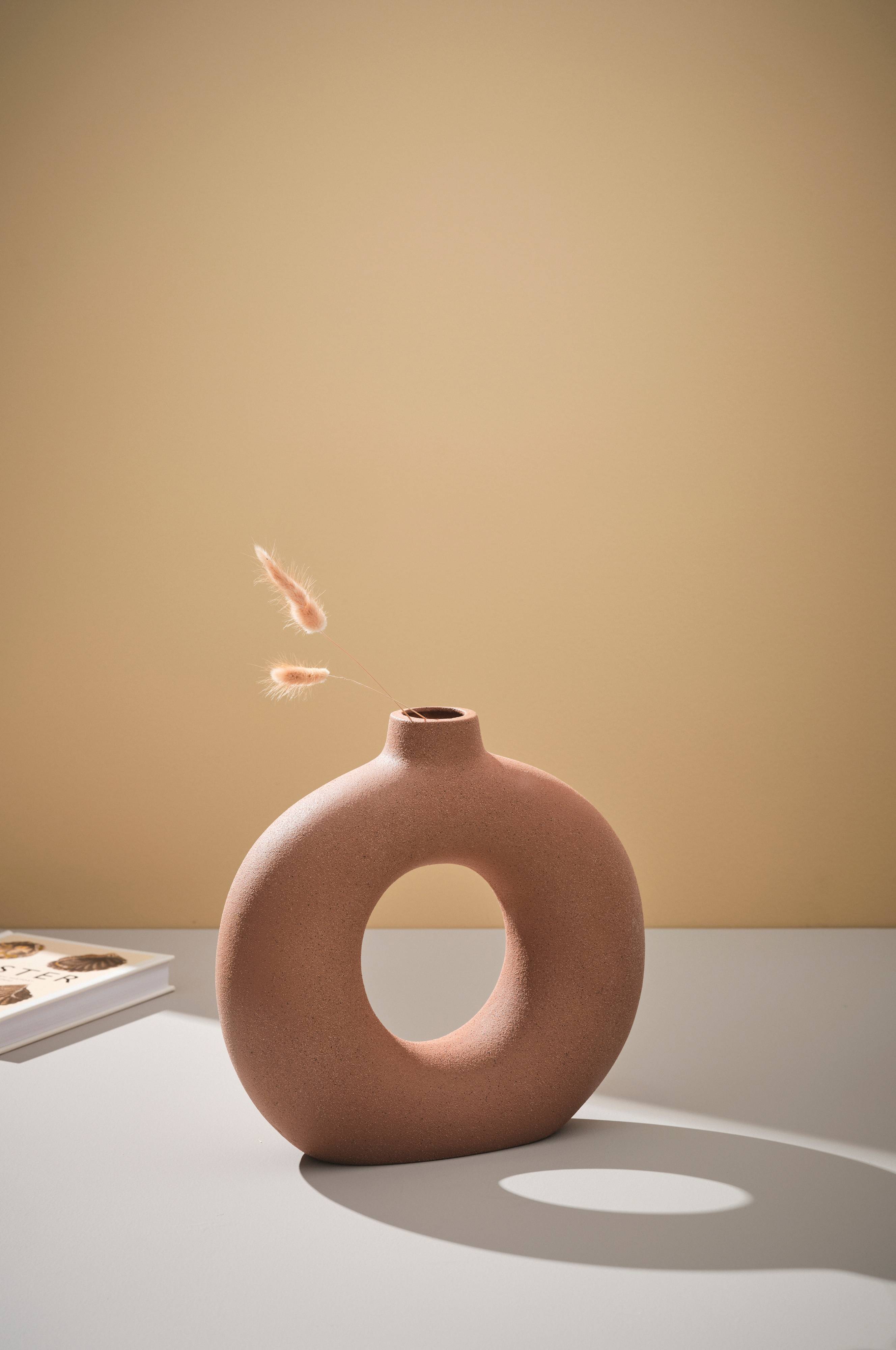 Håndlaget vase av keramikk. Vasen har en spesiell, rund form med spennende retrofølelse. Den matte finishen, en form for sandglasur, gir naturnære vibrasjoner. Innsiden er glasert. Vasen er håndlaget, noe som gjør hvert eksemplar unikt. Husk at keramikk kan slippe gjennom fukt.