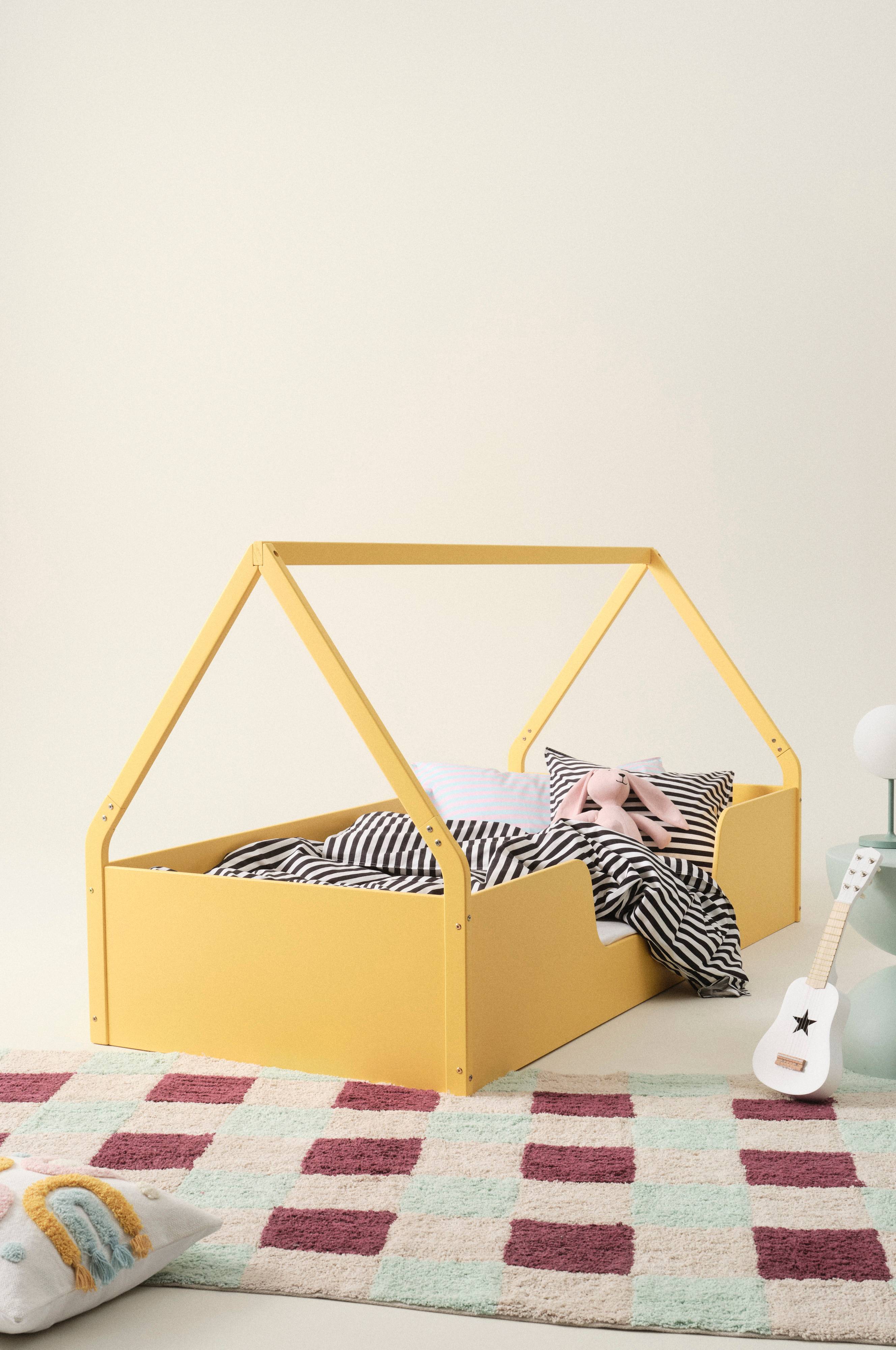 Sengeramme med ramme i massiv furu, sider i MDF og bunn i ubehandlet kryssfiner. Både furu og MDF er FSC-merket. Fargen er vannbasert. Den ene langsiden har en nedsenket kant slik at små barn kan klatre inn/ut selv. En koselig seng gjør det morsommere å legge seg, for hvem vil vel kjede seg? Med mange puter og et mykt sengeteppe blir det en koselig krok på dagtid.
