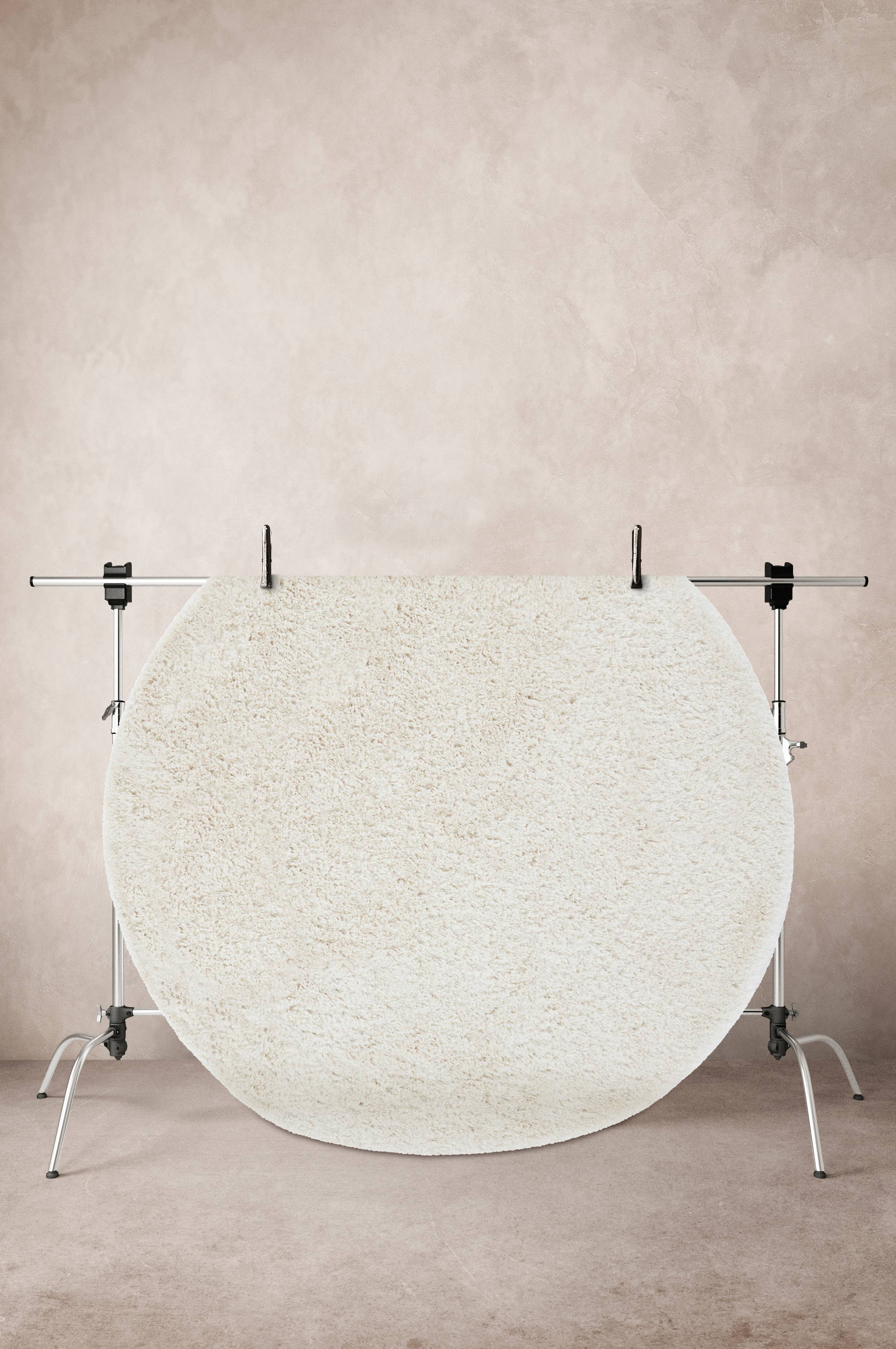 Håndlaget, tett luggteppe av polyester med bakside av polyester/bomull. Den lurvete luggen er ensfarget, og gir et livlig inntrykk av at garntrådene i teppet har varierende tykkelse. Et kraftig luggteppe gir også mer dempet lyd. Lugghøyde 5 cm, 1400 g/m².