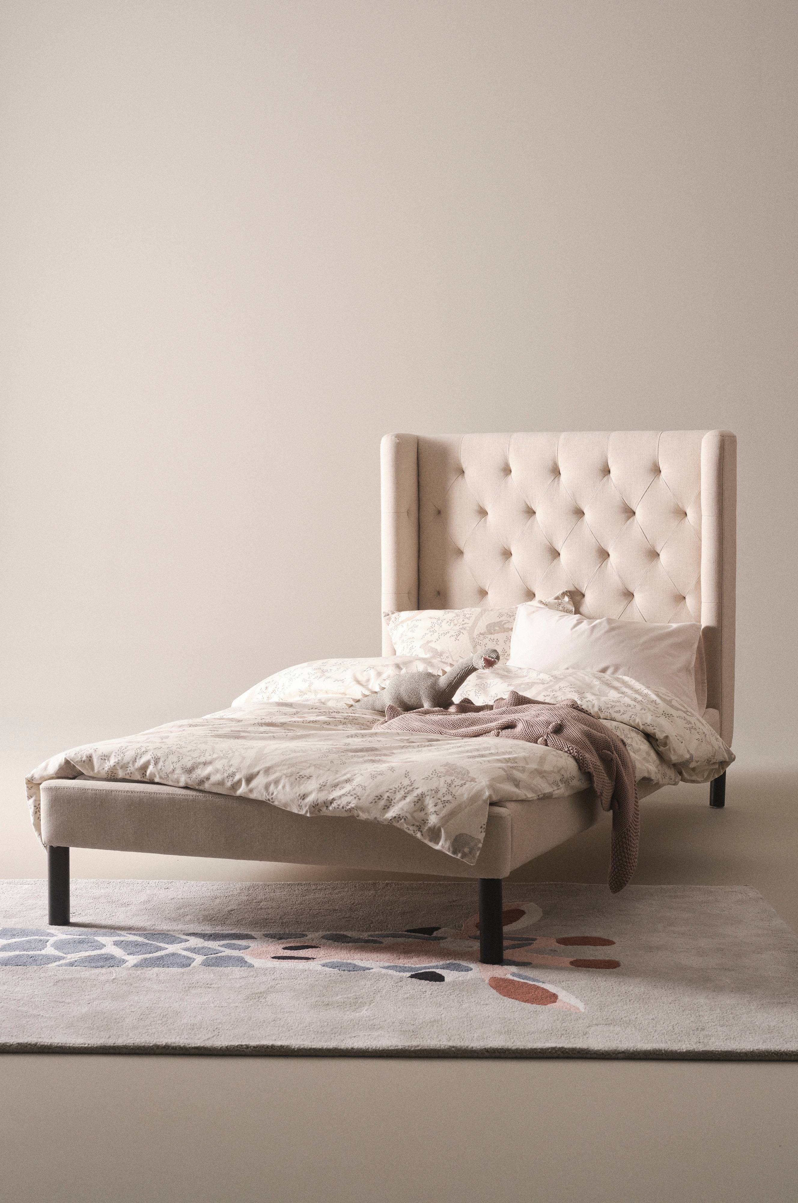 Barneseng med høy, kledd sengegavl. Ramme av FSC-sertifisert furu og ribbebunn av FSC-sertifisert kryssfiner med polyamidbånd. De runde, rette bena er av malt bjørk. Sengegavlen og rammen rundt er kledde med vattert stoff av lin og bomull med fin lintekstur. Gavlen har dypt heftede knapper og en liten kant på hver side. CESENA er både elegant og koselig. Det er deilig å lene seg mot den komfortable sengegavlen og lytte til et eventyr. Madrassmål 90x200 cm. Madrass medfølger ikke.