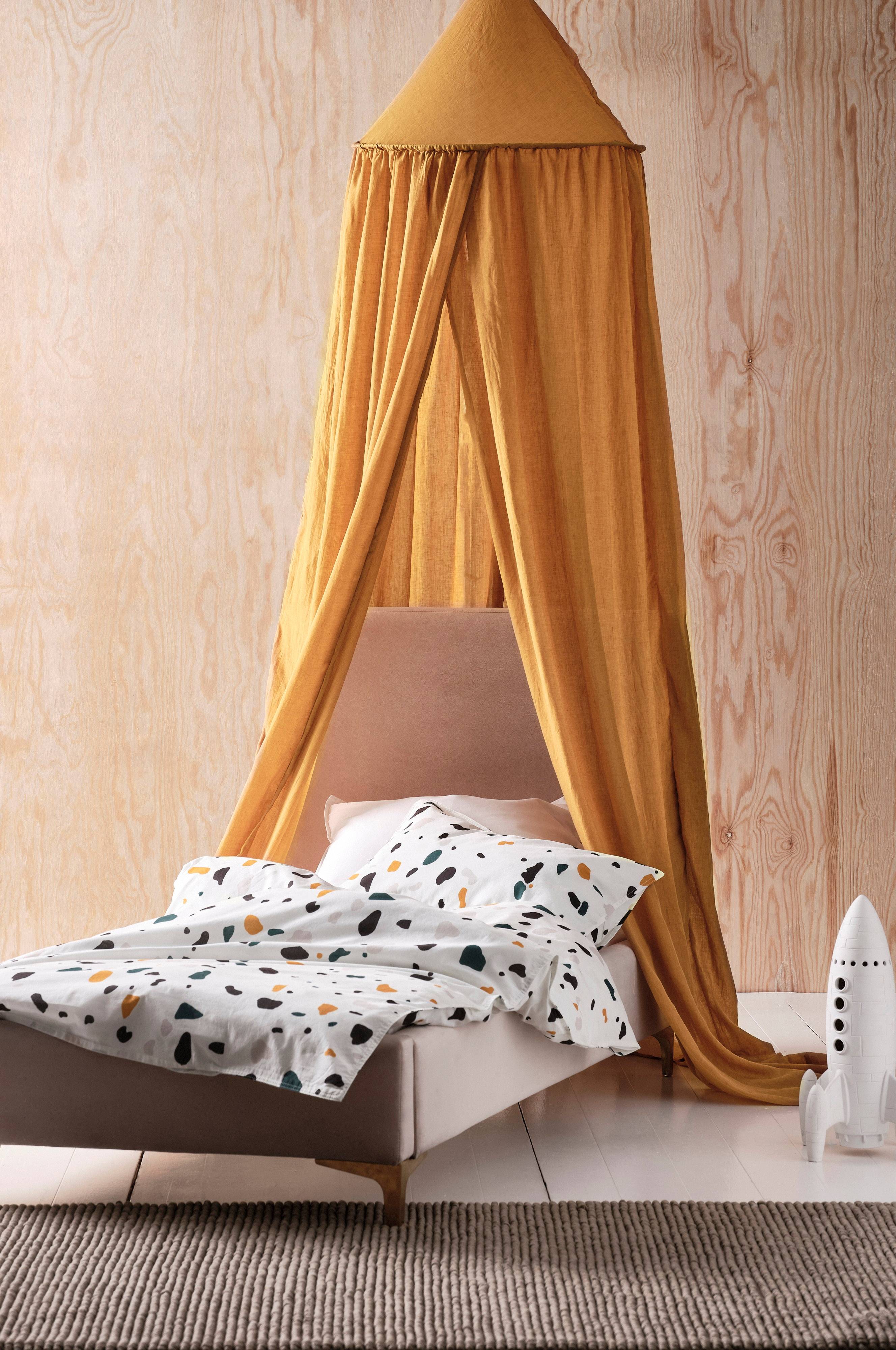 Sengehimmel i myk bomullsblanding som gir et fint fall. Denne sengehimmelen er åpen både i forkant og bakkant, noe som er en fordel hvis du ønsker en sengelampe på veggen bak sengen. Heng opp sengehimmelen på barnerommet for å skape en koselig og lun atmosfære over barnesengen.