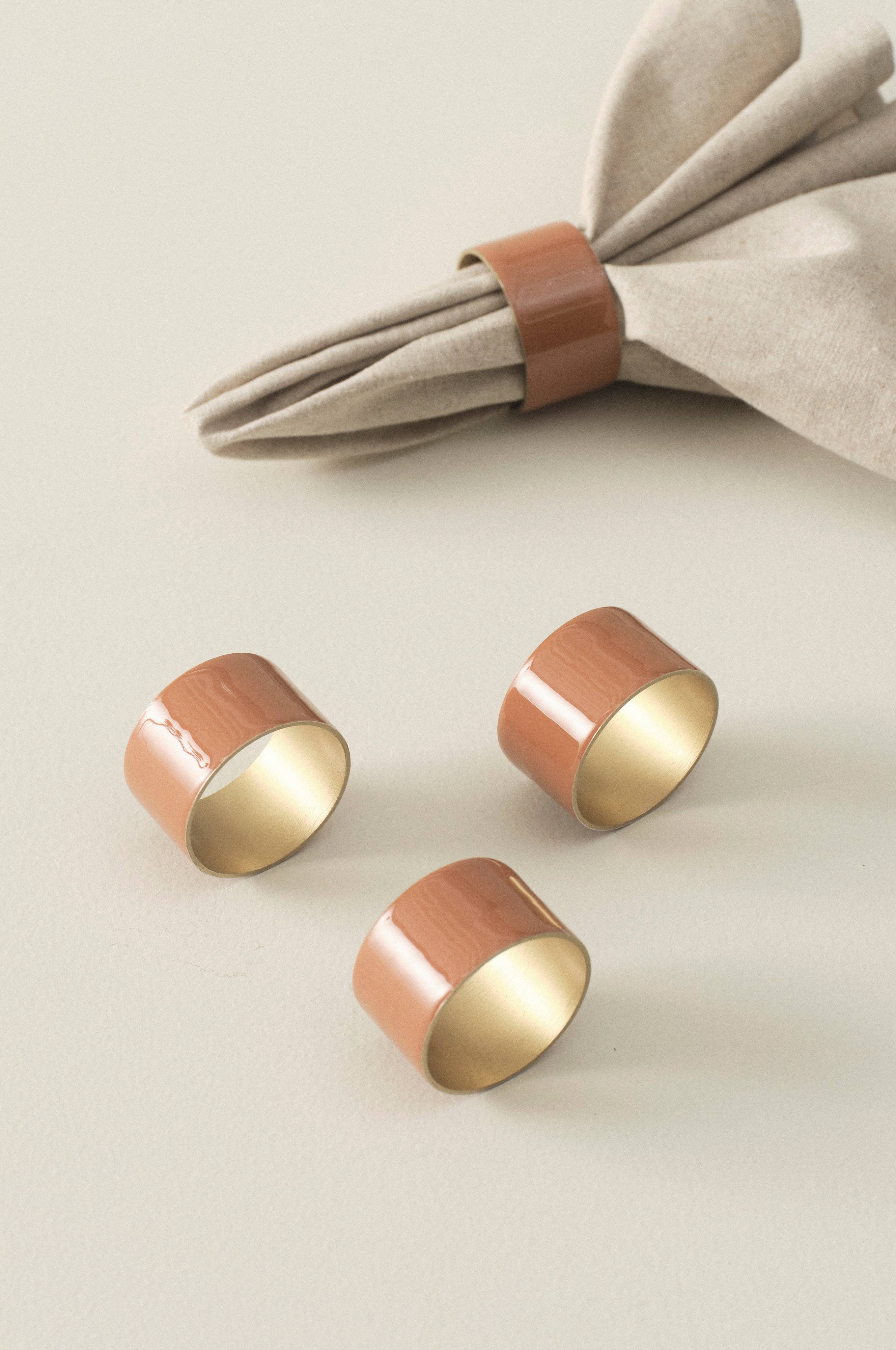 4-pk serviettringer av aluminium. Serviettringene er belagt messing- eller gullfarge innvendig, og utsiden er emaljert i en dempet farge.