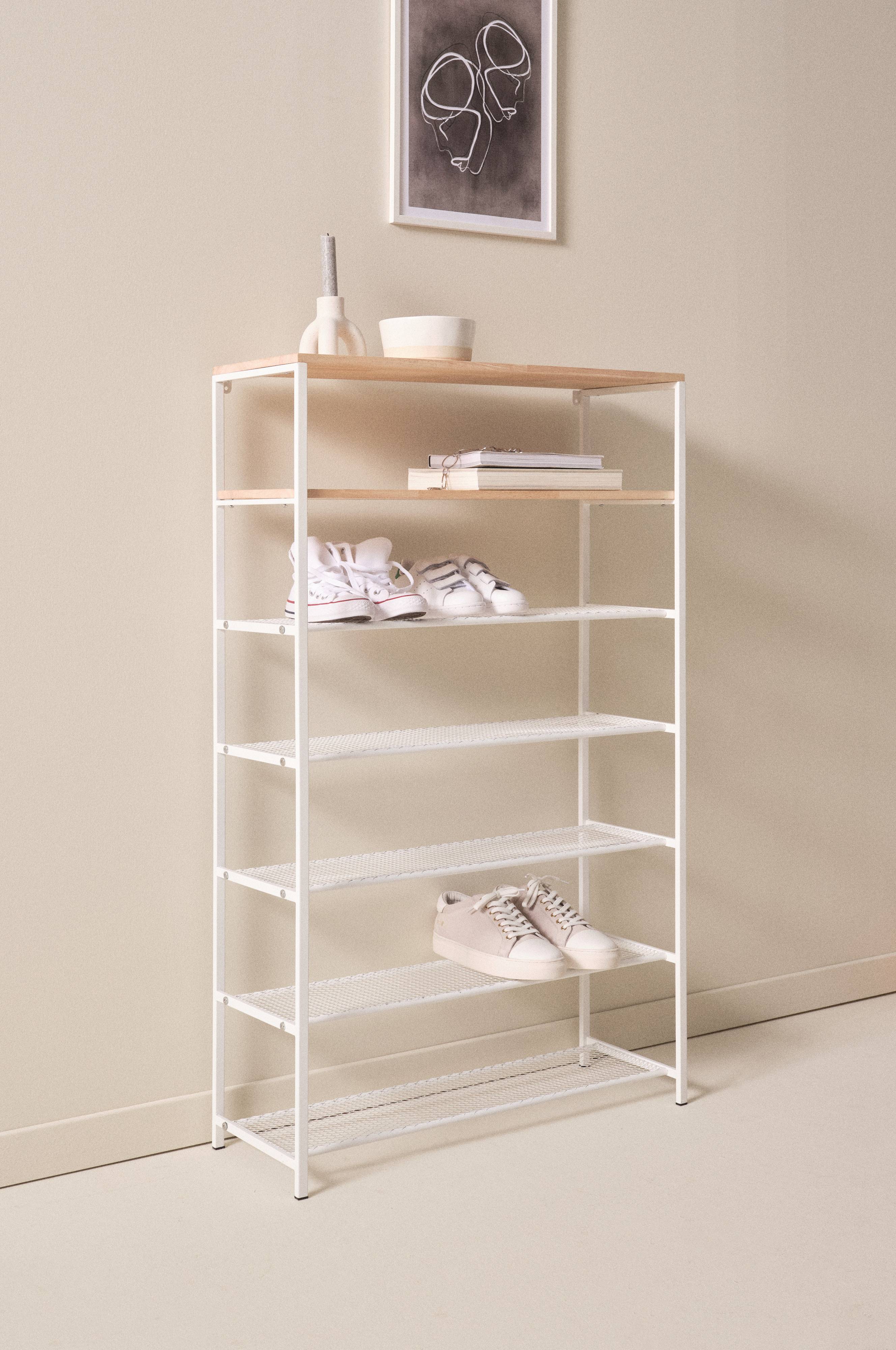 Skohylle i praktisk modell, produsert av jern og eik i pen kombinasjon. Skohyllen rommer mange par sko da den har fem hyller til sko. Øverst har den dessuten to hyller i eik til alt fra votter og mobiler til nøkler og små vesker. Hyllen har firkantet profil i rammen, skohyllene er kledd med fin netting av metall. De to øverste trehyllene har skjønnheten som bare eik kan ha. Samle skoene på ett sted for å lettere holde orden i gangen. Fremkommeligheten blir også bedre ved å frigjøre gulvplass. Noe montering kreves. Monteringsanvisning medfølger.