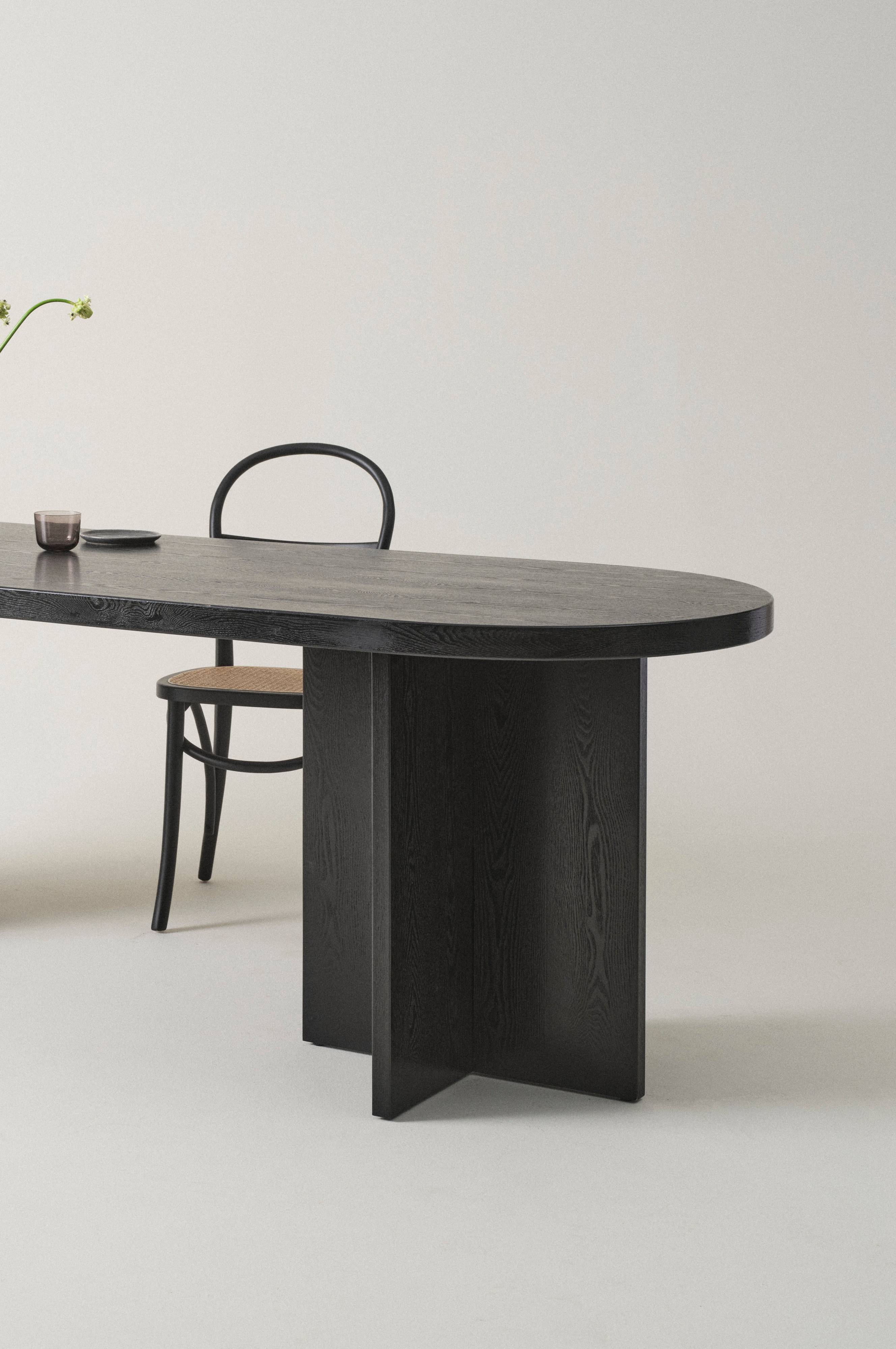 Ovalt bord av MDF med svart askefinér. Bordets form er harmonisk, det smelter inn og har en myk fremtoning. De stabile bena i hver ende gir bordet karakter, og benas plassering gjør det behagelig å sitte ved bordet. Passer for fire til seks personer. Metallbeslag for montering av bordplaten medfølger. Noe montering kreves. Monteringsanvisning medfølger.