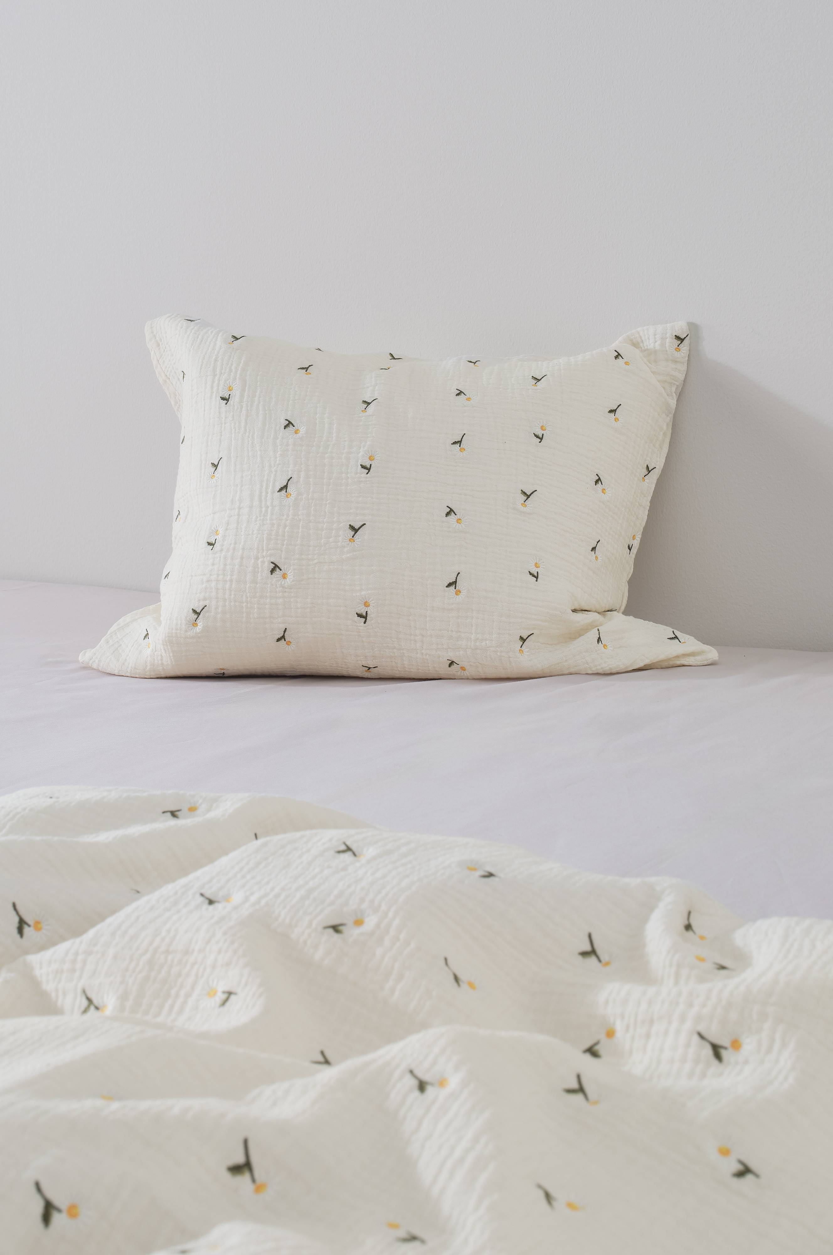1-pk putevar i herlig, økologisk bomullsmusselin med diskre mønster av broderte tusenfryd. Sengetøy i serien DAISIES føles sommerlig friskt. Musselin er et mykt, tynt stoff i to lag, vevd med litt boblete effekt, noe som gjør stoffet mykt og ekstra lettstelt. Du trenger hverken stryke eller mangle. Det behagelige musselinstoffet er deilig å sove i. Baksiden er ensfarget. Trådtetthet på 178 tc. (Trådtettheten forteller om antallet tråder, thread counts, pr. kvadrattomme i et stoff. Jo høyere trådtetthet, desto høyere kvalitet.)