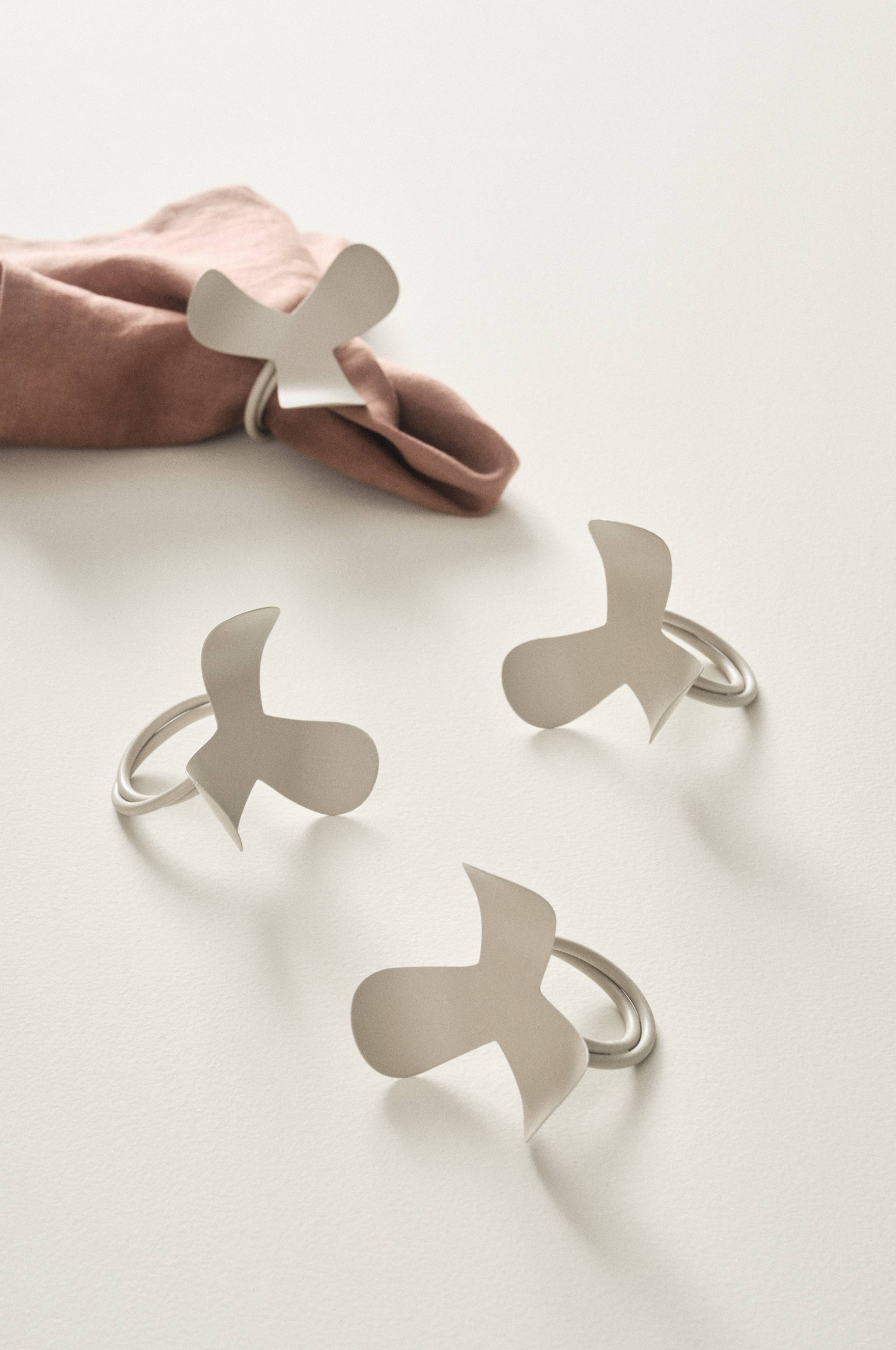 4-pk serviettringer av stål. To ringer er tvunnet og utstyrt med en stor fin blomst. Fargen er pulverlakkert og har matt overflate.