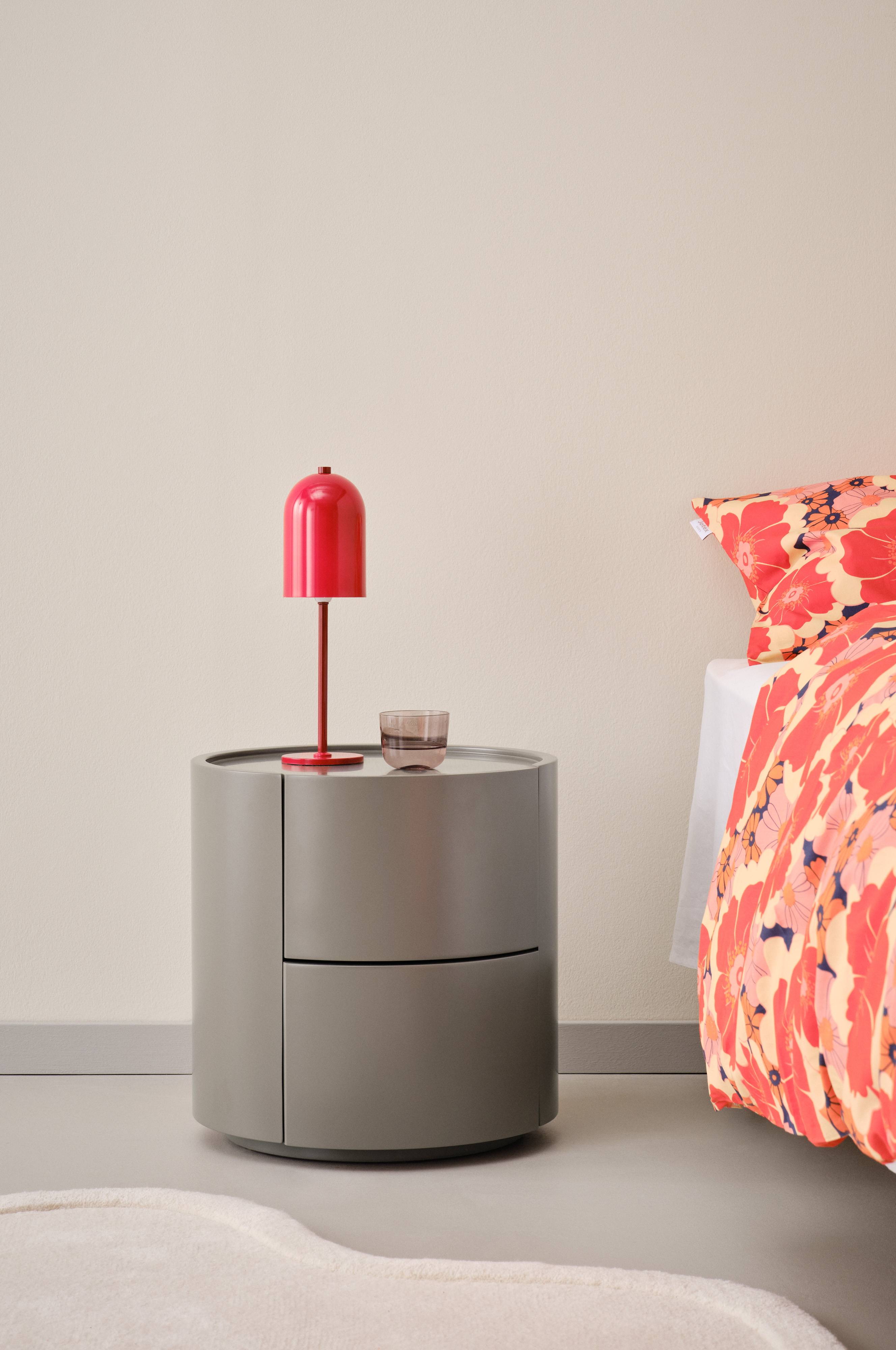 Nattbord i MDF med rund form og to praktiske skuffer gir et moderne preg til ethvert hjem. Bordet er kompakt og stilig, og passer perfekt ved siden av sengen for å holde det viktigste innen rekkevidde.