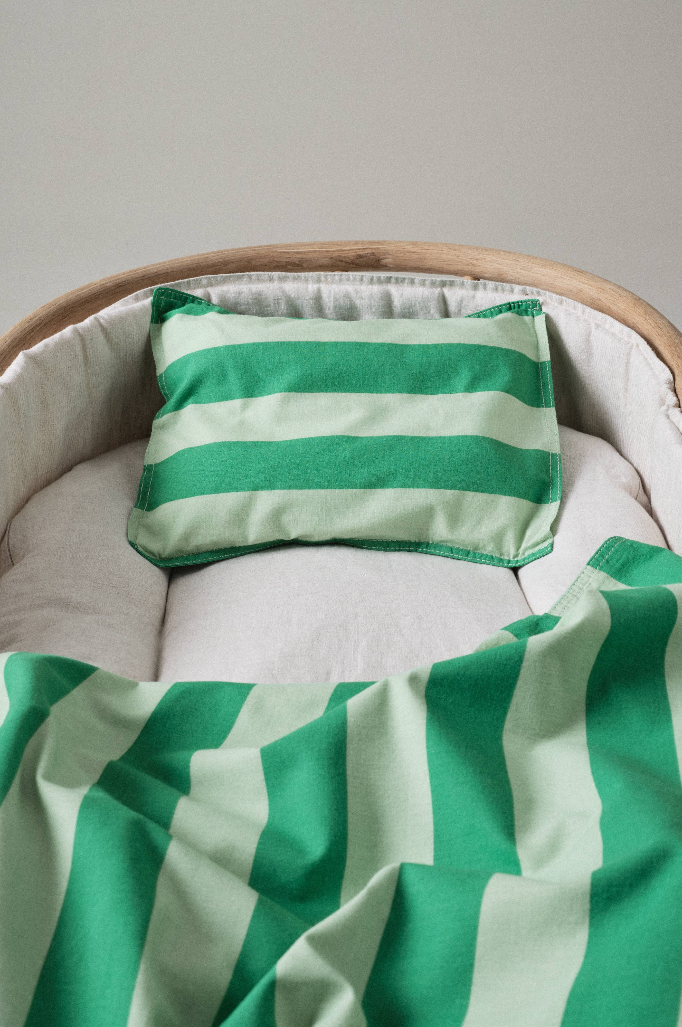 1-pk putevar av økologisk bomull. Settet passer til sprinkelseng. Blokkstripete mønstertrykk er alltid fresht, også til de minste, og å sove i økologisk bomull føles svalt og deilig mot huden. Putevaret er dessuten plaggvasket. Det betyr at det er vasket etter søm slik at følelsen blir ekstra myk og deilig. Dobbeltsøm rundt gir en eksklusiv følelse. Trådtetthet på 144 tc. (Trådtettheten forteller om antallet tråder, thread counts, pr. kvadrattomme i et stoff. Jo høyere trådtetthet, desto høyere kvalitet).