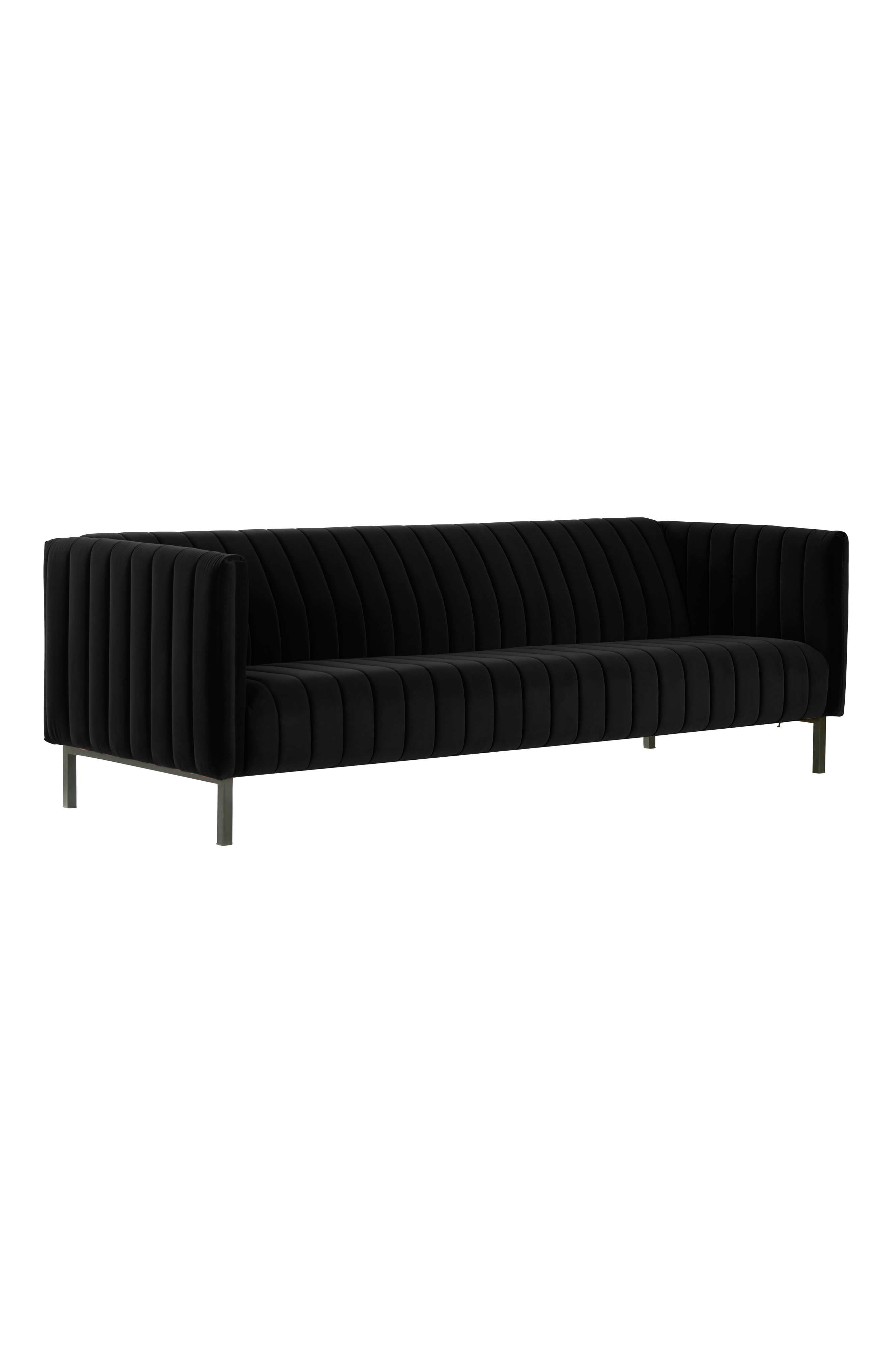 FAYETTE 3-seter sofa er en komfortabel fløyelssofa med retrofølelse som oppstår i kombinasjonen av fløyel og den quiltede stripeeffekten på ryggstøet og setet. Den faste stoppingen gir behagelig sittekomfort. Sofaen får en smekker følelse med de nette, svarte metallbena. FAYETTE 3-seter sofa har en stabil stamme av furu og kryssfiner med god sittekomfort takket være sin fantastiske oppbygging av kaldskum, sikksakkfjæring, strikkbånd samt herlig polyesterstopp.