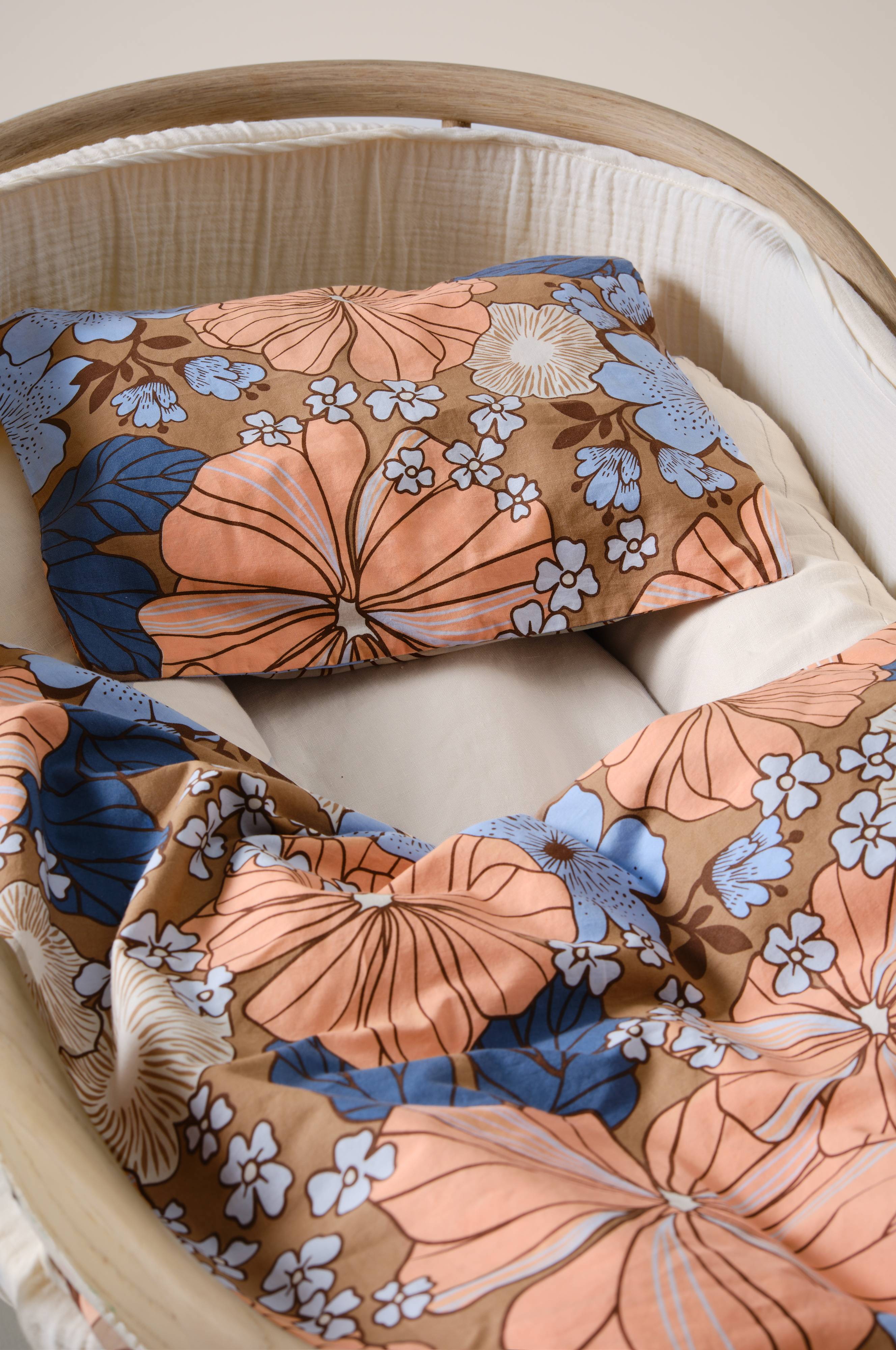 Todelt dynetrekkssett med et dynetrekk og et putevar i fintrådet, tettvevd bomullskvalitet. Stoffet har et herlig blomstermønster med trykk i en vakker fargeskala. Det er også enzymvasket, noe som gir det en behagelig mykhet og en litt slitt følelse. Settet er egnet for barnevogner og -vogner.