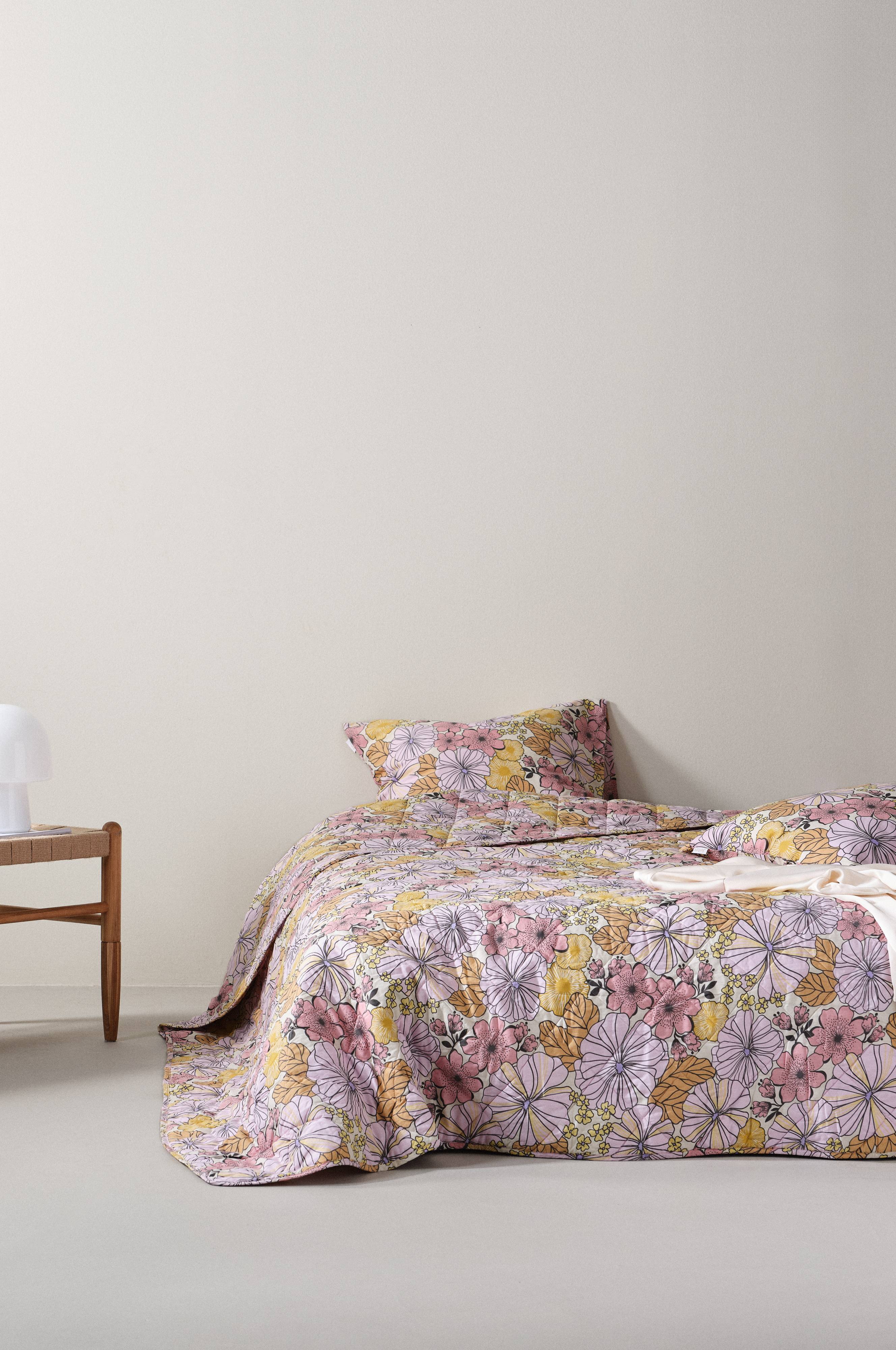 Sengeteppe i fin, tettvevd bomullskvalitet. Stoffet har et nydelig blomstermønster i en fin fargeskala, og det er vattert slik at det lette fyllet holder seg på plass. Det er også enzymvasket, noe som gir det en behagelig mykhet og en litt slitt følelse. Sengeteppet er vendbart med blomster på begge sider og kant rundt.