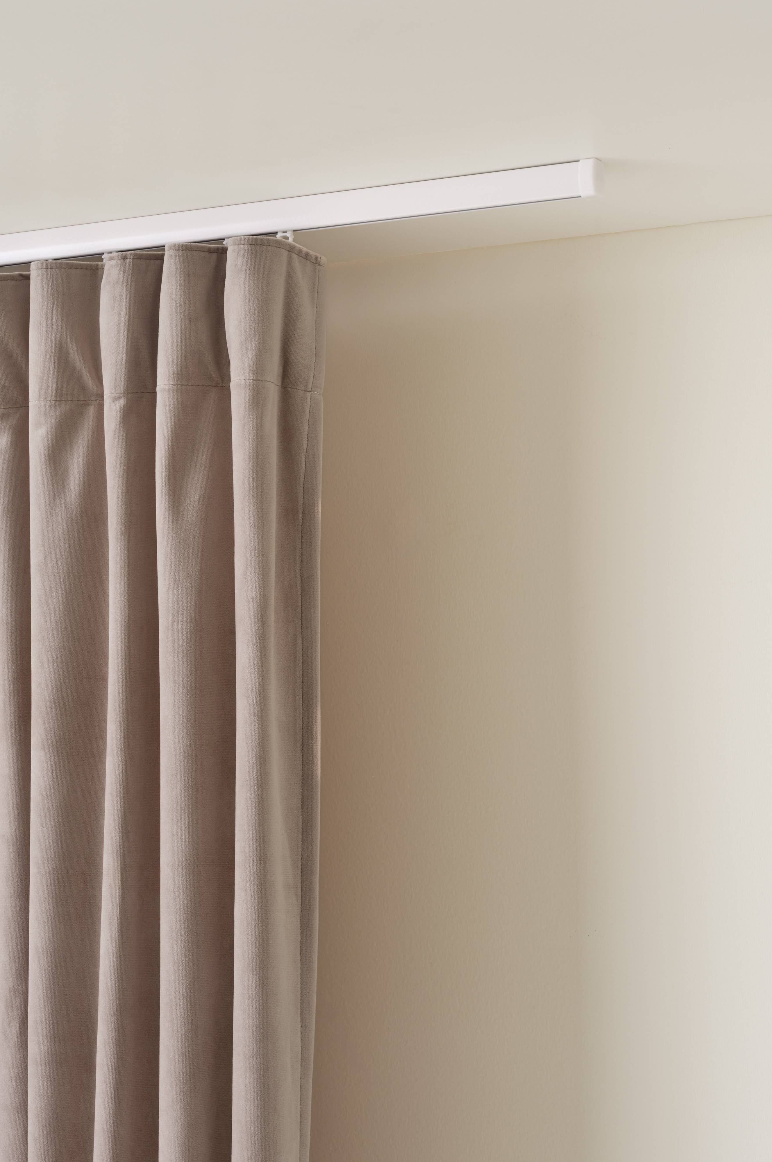 Monteres i tak eller på vegg. Skinneprofil: B 13 x H 20 mm. Fleksibel gardinskinne som kan monteres på vegg eller i tak.
