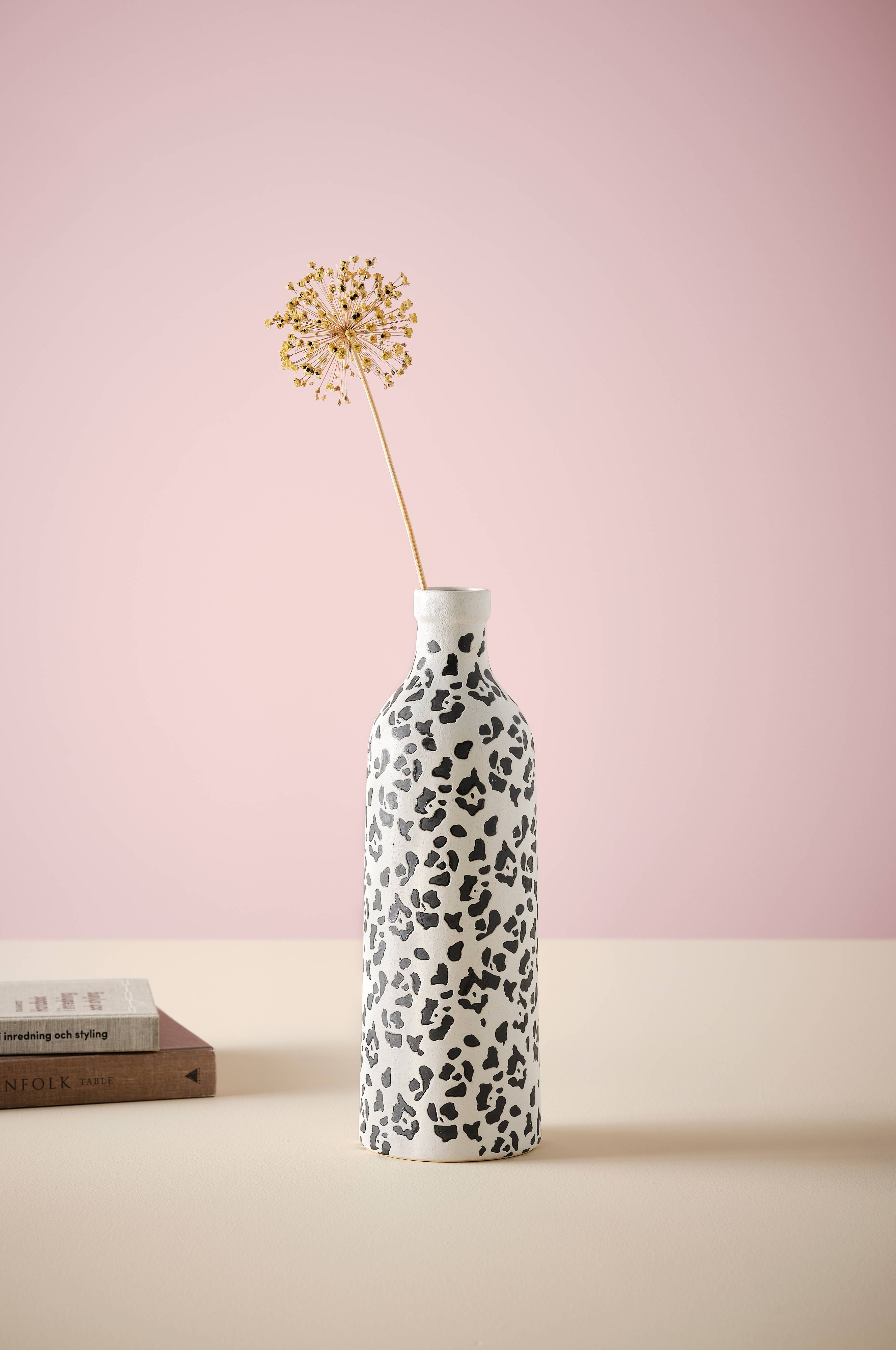 Høy vase av keramikk. Vasen er flaskeformet med dyremønstret relieff. Innsiden er også glasert. Et visst avvik kan forekomme ettersom vasen er håndmalt. Keramikk kan slippe gjennom fukt.