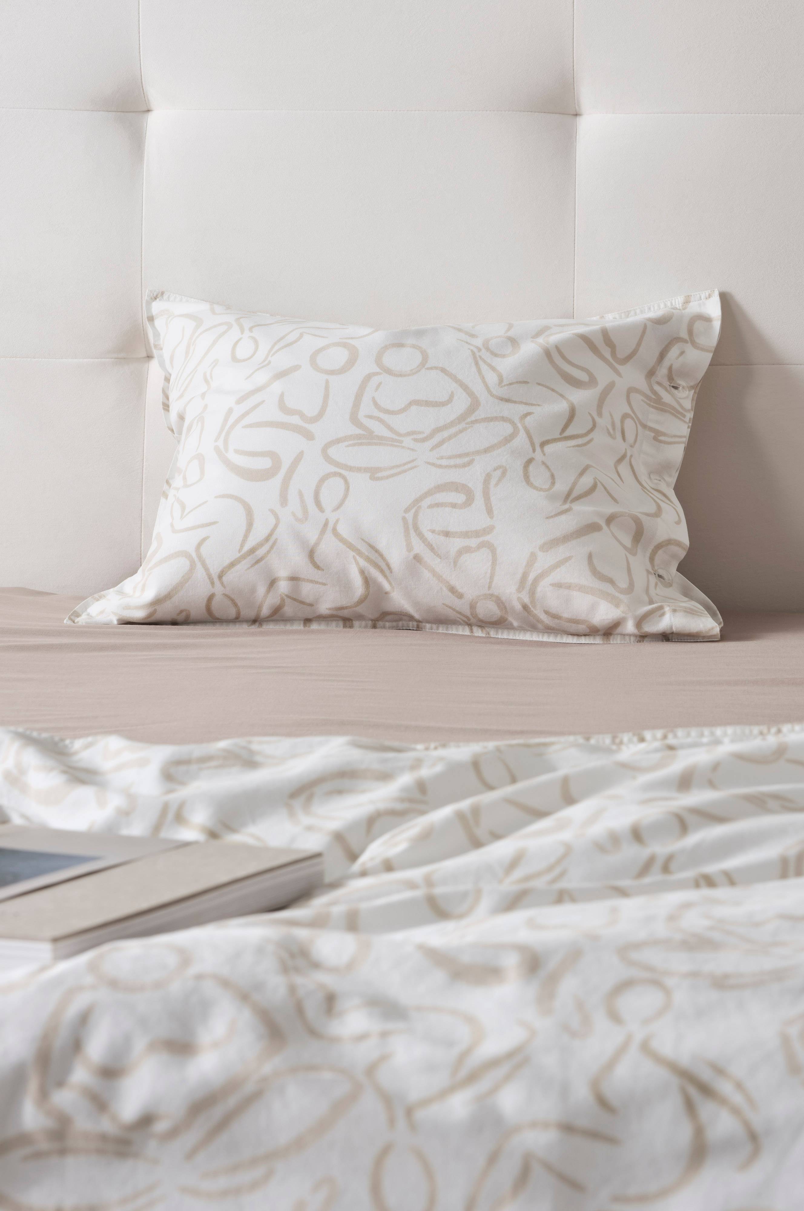 1-pk putevar av 100% bomull, hvorav 70% er gjenvunnet bomull. Serien FORMS har et sensuelt mønstertrykk som kan oppleves abstrakt, men du kan skimte mykt tegnede kvinner. Den lyse bunnfargen gjør at oppredningen føles fresh og luftig. Bomullen er enzymvasket, noe som gir en myk og litt slitt følelse. Bomull er en komfortabel kvalitet å sove i. FORMS har dobbeltsøm rundt putevaret og transparente plastknapper for lukking. Trådtetthet på 120 tc. (Trådtettheten forteller om antallet tråder, thread counts, pr. kvadrattomme i et stoff. Jo høyere trådtetthet, desto høyere kvalitet.)