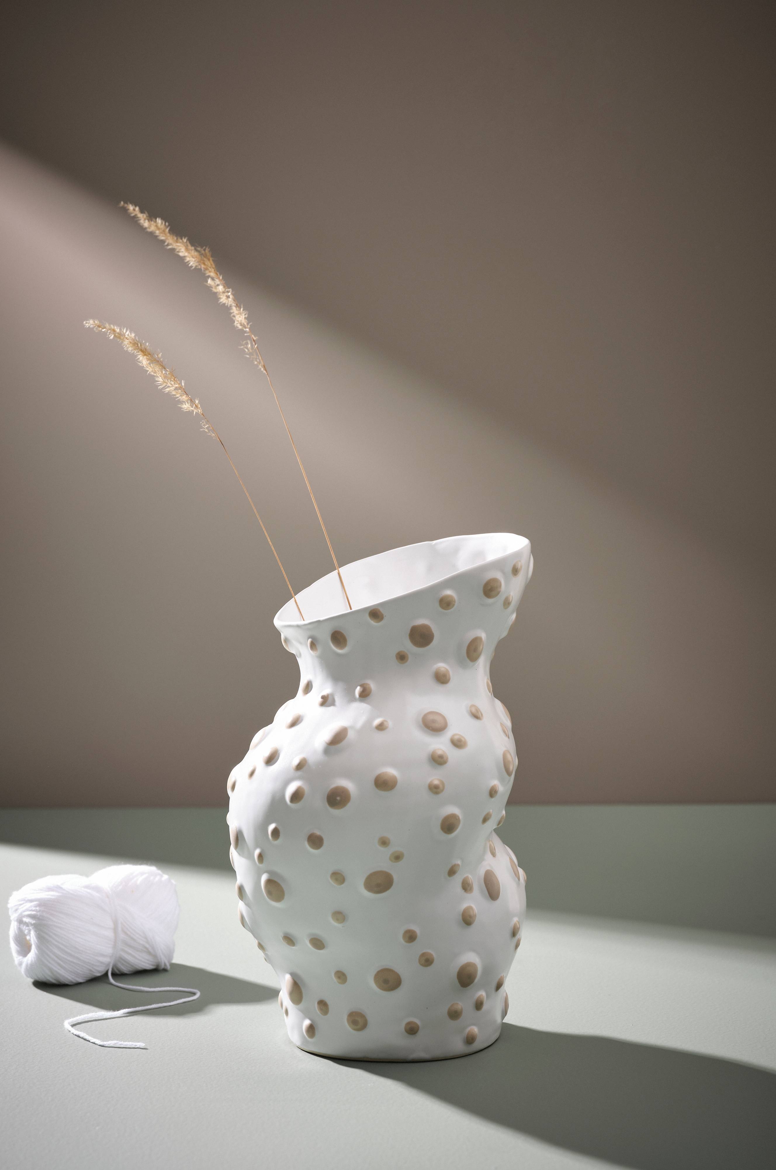 Dekorvase av keramikk. Vasen er håndlaget med en uregelmessig fasong og et dekorativt prikkete mønster. Innsiden er også glasert. Et visst avvik kan forekomme ettersom vasen er håndlaget. Keramikk kan slippe gjennom fukt.