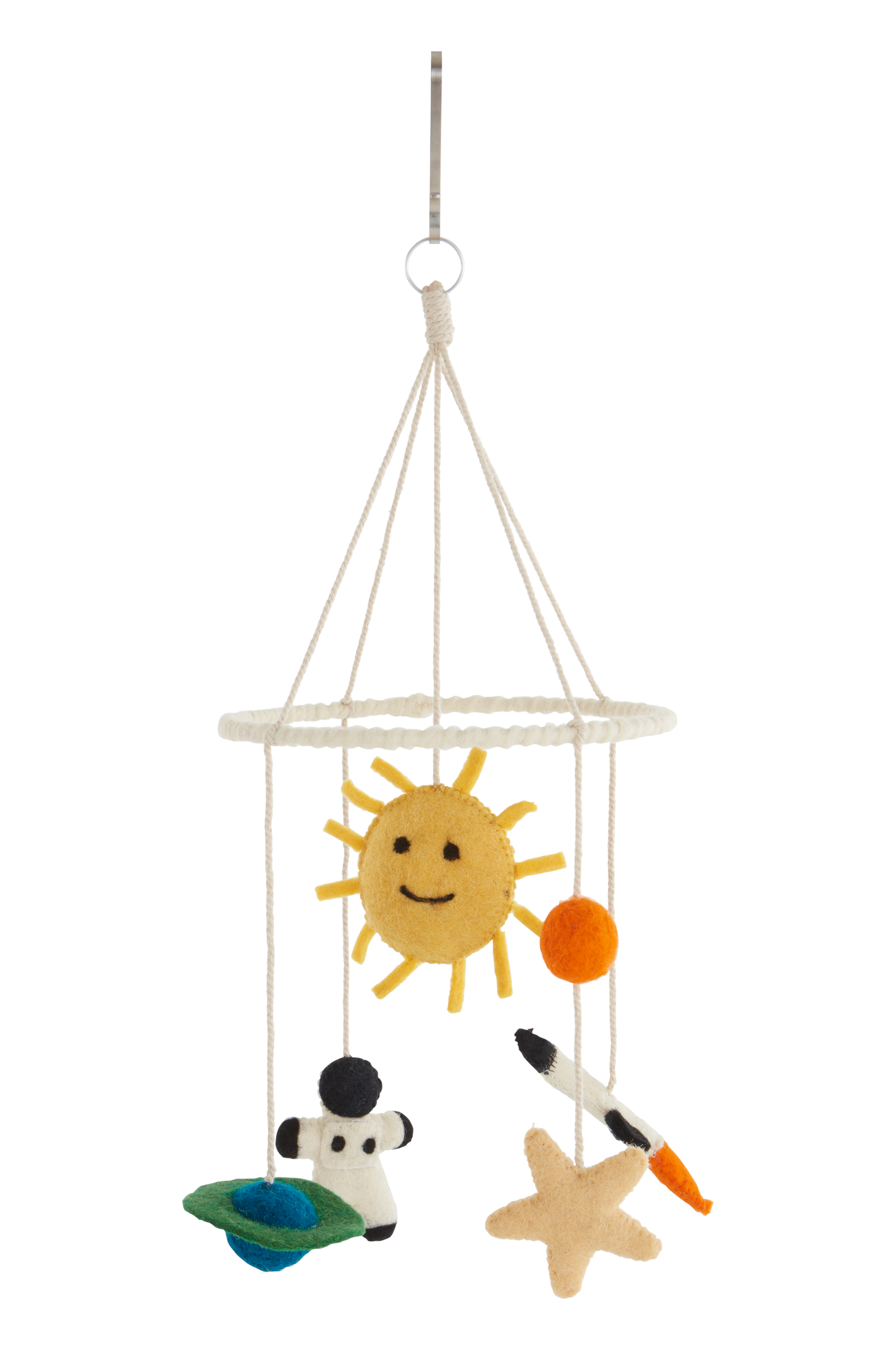 Håndlaget uro med fem søte figurer fra verdensrommet og galaksen. Figurene er av tovet ull. Ull er et herlig naturmateriale, og de er stoppet med polyester. Figurene henger i bomullstråd på en kledd stålring. Den lille ringen i toppen henges på en krok eller i et bånd fra taket. Det fine håndverket gjør hver uro unik.