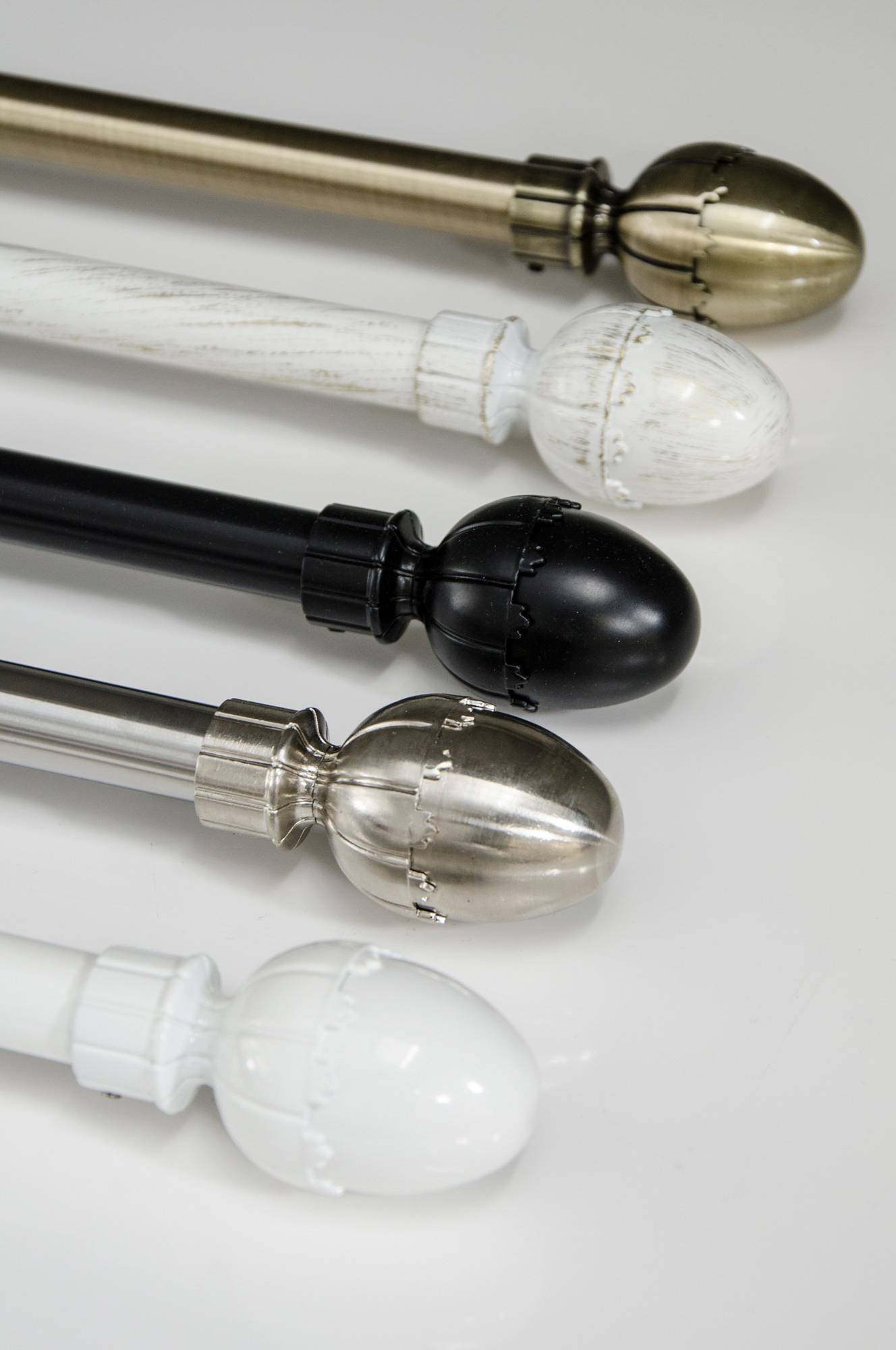 Komplett klassisk gardinstangsett i metall, 16/19 mm. Settet inneholder justerbare stenger 130-240 cm, 2 stk endeknotter og 3 stk veggfester (8 cm).