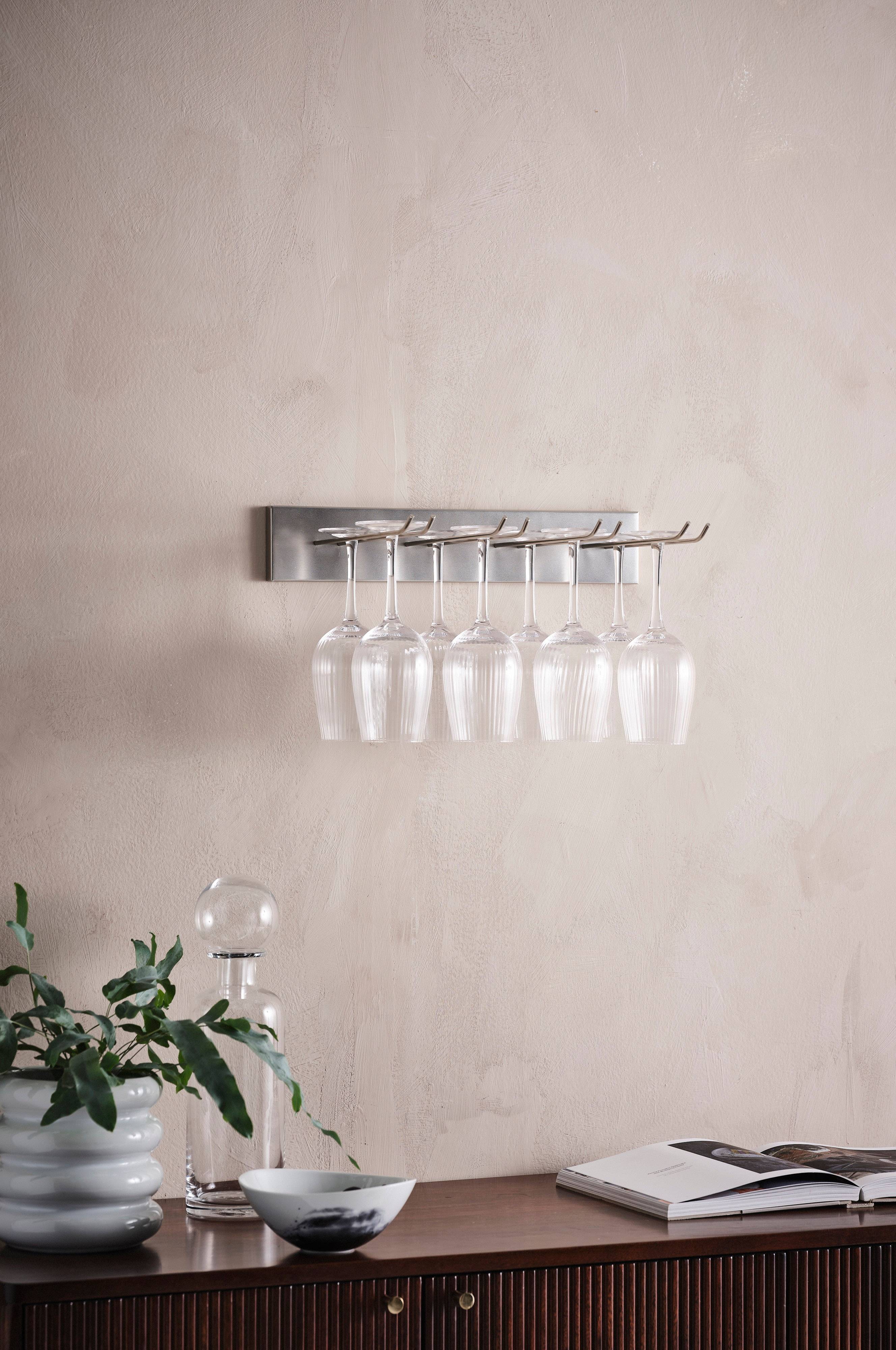 Vinglassholder i jern. Fin på veggen med favorittglassene hengende - praktisk og dekorativt. Denne modellen har fire hengere for glass med stett. Obs! Glass medfølger ikke. Kjøpes separat.