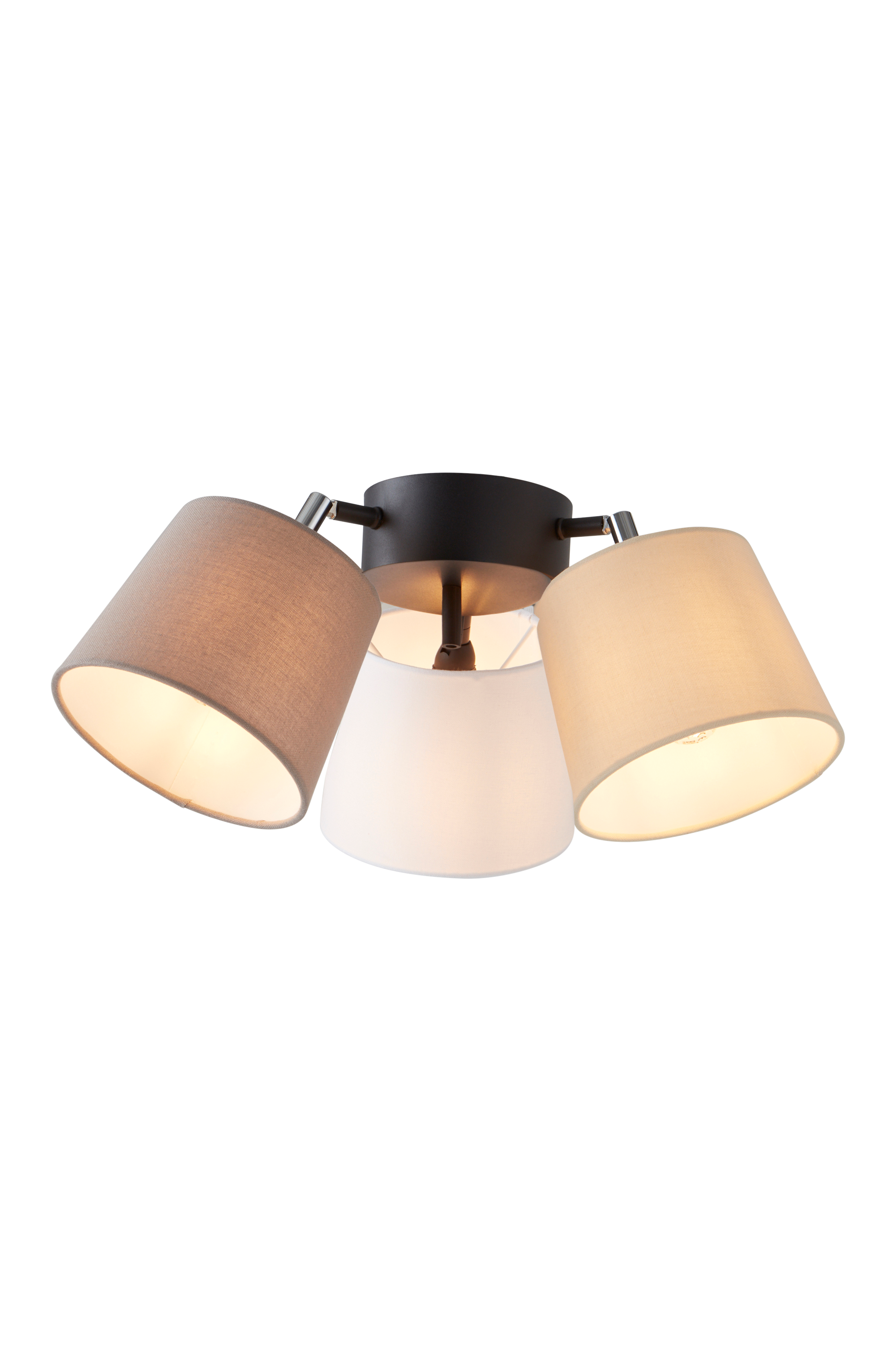 Takplafond med tre tekstilskjermer med lintekstur og takfeste av metall. Lampeskjermene kan rettes opp eller ned etter ønske. Skjermene har en diskre stamme av metall. De tre lampeskjermene sitter nær takkoppen. Det gjør at lampen kan plasseres også der det er mye trafikk, den henger ikke i veien. Krokoppheng i takkoppen. Lampen er jordet, klasse 1. På grunn av EU-regler kreves en separat takkontakt i visse land. Takkontakten skal være jordet (klasse 1), og kjøpes separat.