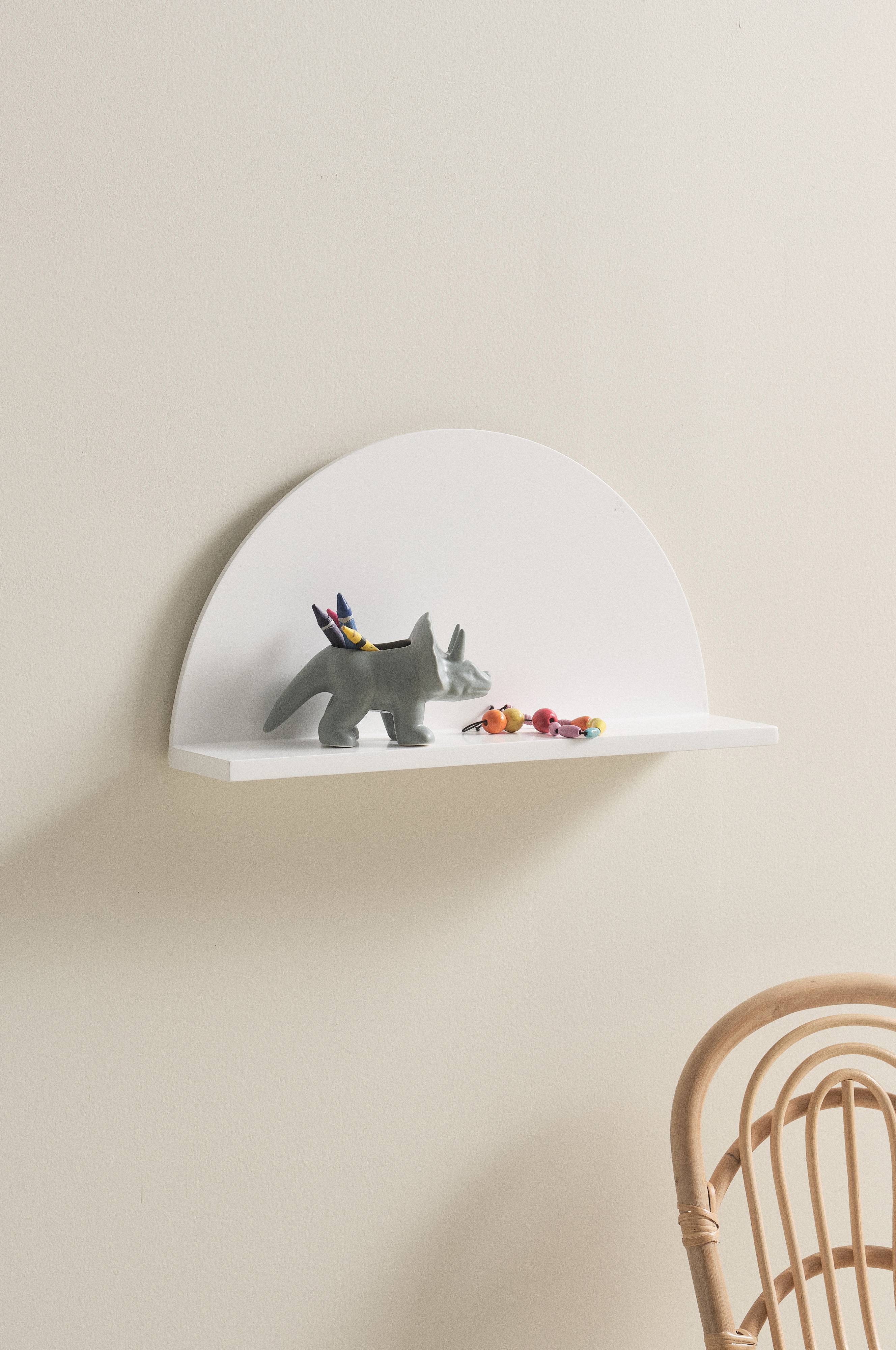 Håndlaget vegghylle av MDF. GIRO er en nett, liten hylle som passer perfekt på barnerommet. Hyllen har malt overflate. Den halvrunde formen kan minne om en halvmåne. Skjulte hull for oppheng.