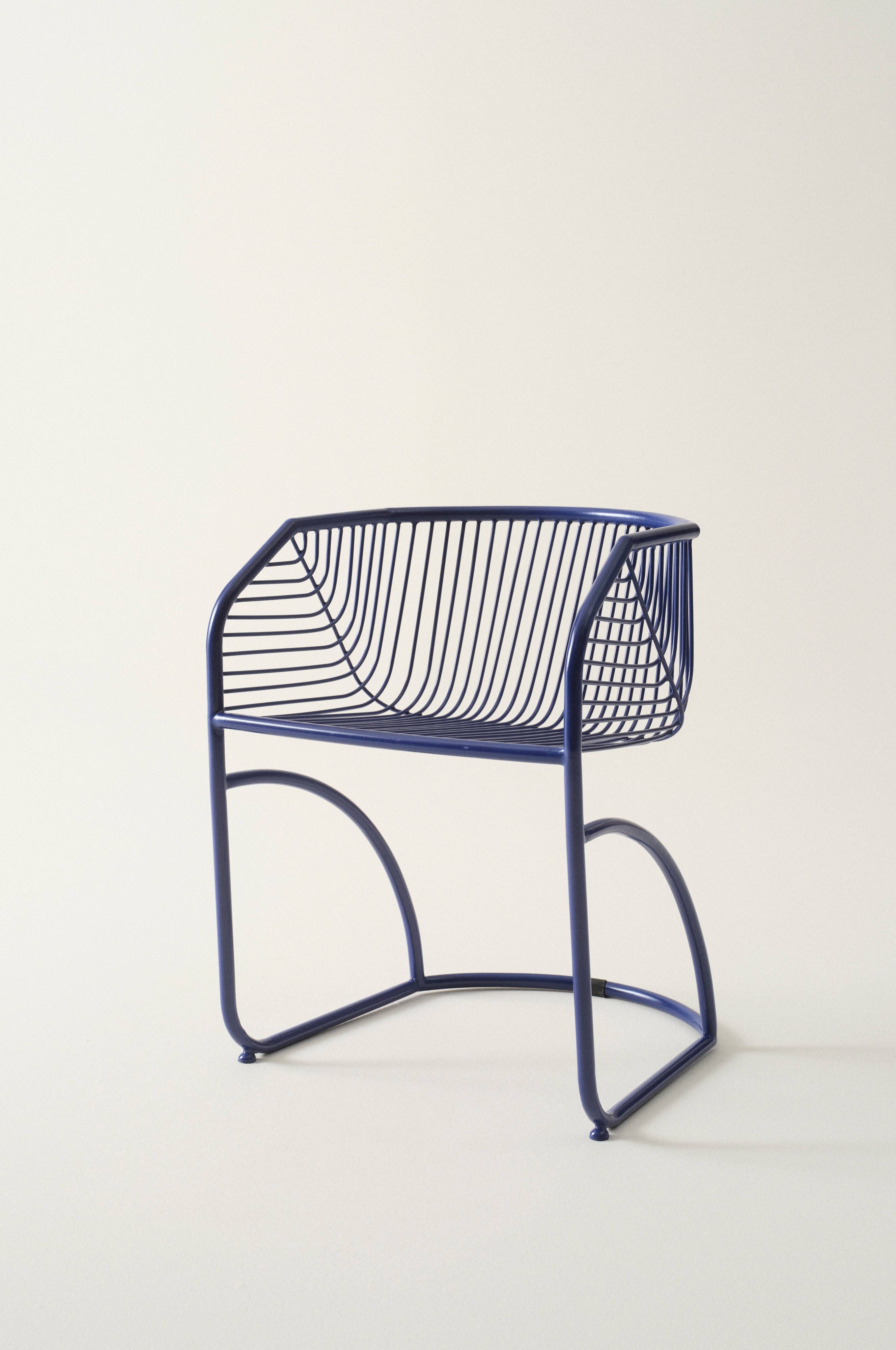 Stol i praktisk og trendy modell av rustfritt stål med pulverlakkert overflate. Stolen er stabil og vipper ikke, selv om det kanskje kan se slik ut. Den svarte har matt overflate med lett tekstur. Den blå er blank.